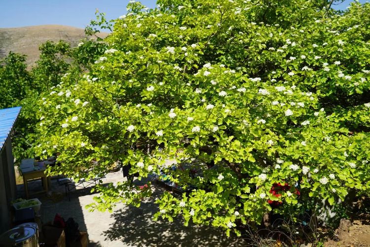 赏花合赏山楂树,乘兴当吟敕勒歌。