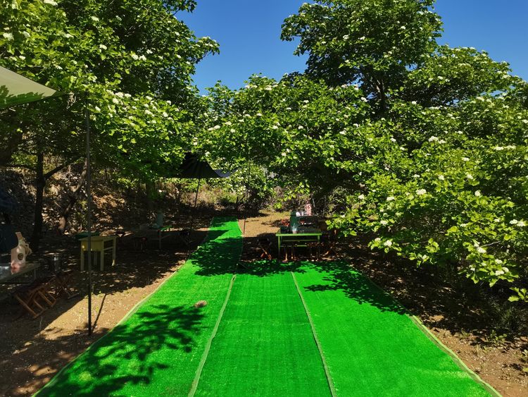 观花万亩山楂树,花下野餐开首步。弯弯石径绕东西,浑似孔明八阵布。 帐 篷座座遮风露,小憩犹如仙景住。山高林茂远皇都,借酒诌成春晓赋。