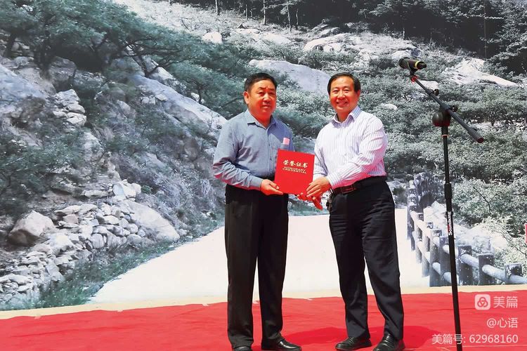 莱芜区文联(区社科联)党组书记、主席、《嬴牟文化》杂志主编卢亮书向封面人物——莱芜区彩石溪旅游开发有限公司总经理任绪昌颁发荣誉证书。