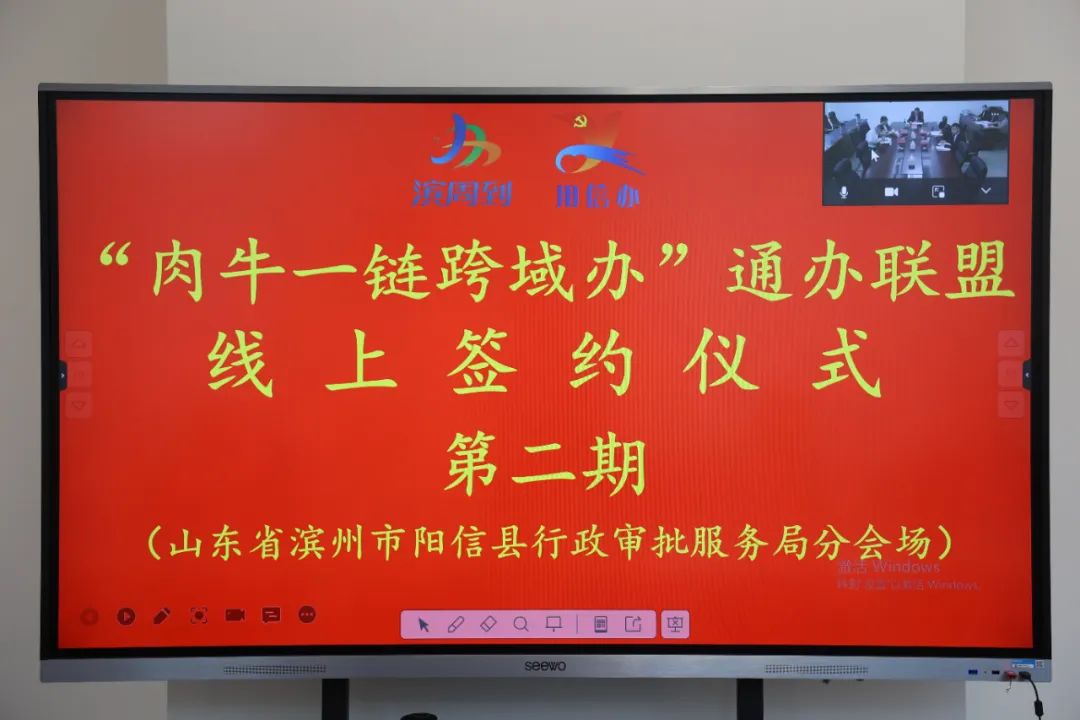 为加深跨区域协作交流,促进特色产业交流互通,加快推进数字政府建设,5月18日上午,由阳信县行政审批服务局牵头,邀请阳信县市场监督管理局、畜牧管理服务中心、人社局、税务局、医保局等相关县直单位出席,在前期“肉牛一链跨域办”通办联盟的基础上,举行通办联盟第二期签约仪式,实现肉牛通办扩容又增量,旧友新朋合作再升级。