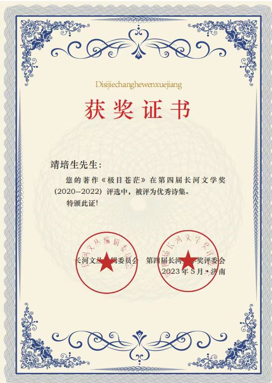 2023年5月7日,由北京长河文丛编委会、中诗在线山东频道主办,花道人生(山东)文化创意集团有限公司承办的“行走花间第四届长河文学奖颁奖典礼”晚会在泉城济南隆重举行,济南诗人靖培生2020年出版的诗集《极目苍茫》在第四届长河文学奖(2020---2022)评选中,被评为优秀诗集奖。