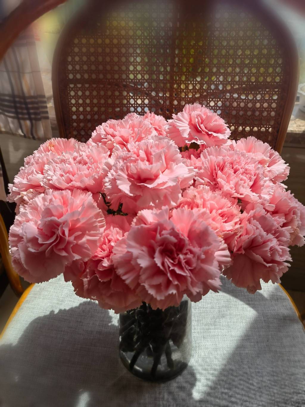 我给妈妈指了指那束粉色康乃馨,妈妈也笑了起来,这笑容像一股暖流传递给我,传递给你,传递给很多人……