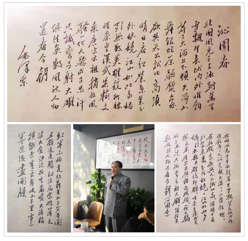 “毛主席来了!”甫一出场,与会嘉宾不由自主全体起立,用热烈的掌声欢迎“毛主席”。只见“毛主席“神清气定,站在主席台上,用那亲切的湖南乡音并伴以双手招呼大家坐下。“毛主席”说:“同志们好!同志们辛苦了”。接着,他用那地道的湖南乡音,即席表演再现了几段毛主席的经典声音片段。大家近距离看着“毛主席”那熟悉的音容笑貌,心里怀着无比激动的心情,不时发出阵阵热烈掌声。刘般伸扮演的毛泽东,形神兼备,出神入化,让大多数人想不到的是,他居然是我们地地道道的济南老乡!