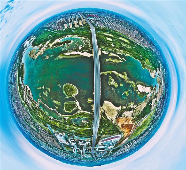 空中俯瞰山东日照市莒县沭河国家湿地公园,一江碧水,两岸秀色,展示出“河在城中,城在景中”的生态水韵之美。刘曙松 摄(中经视觉)