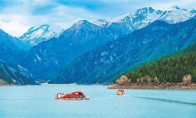 新疆昌吉回族自治州天山天池景区,游客乘环保游船,览湖光山色。目前,天山天池景区已全面进入旅游季。陶维明 摄(中经视觉)
