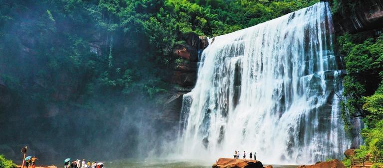 游客在贵州省赤水市赤水丹霞旅游区大瀑布游览。易盛武 摄(中经视觉)