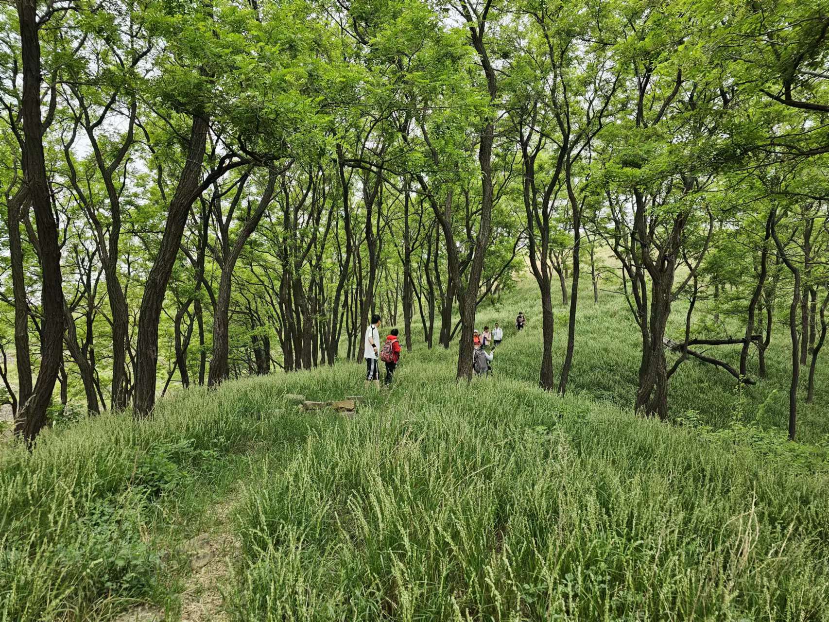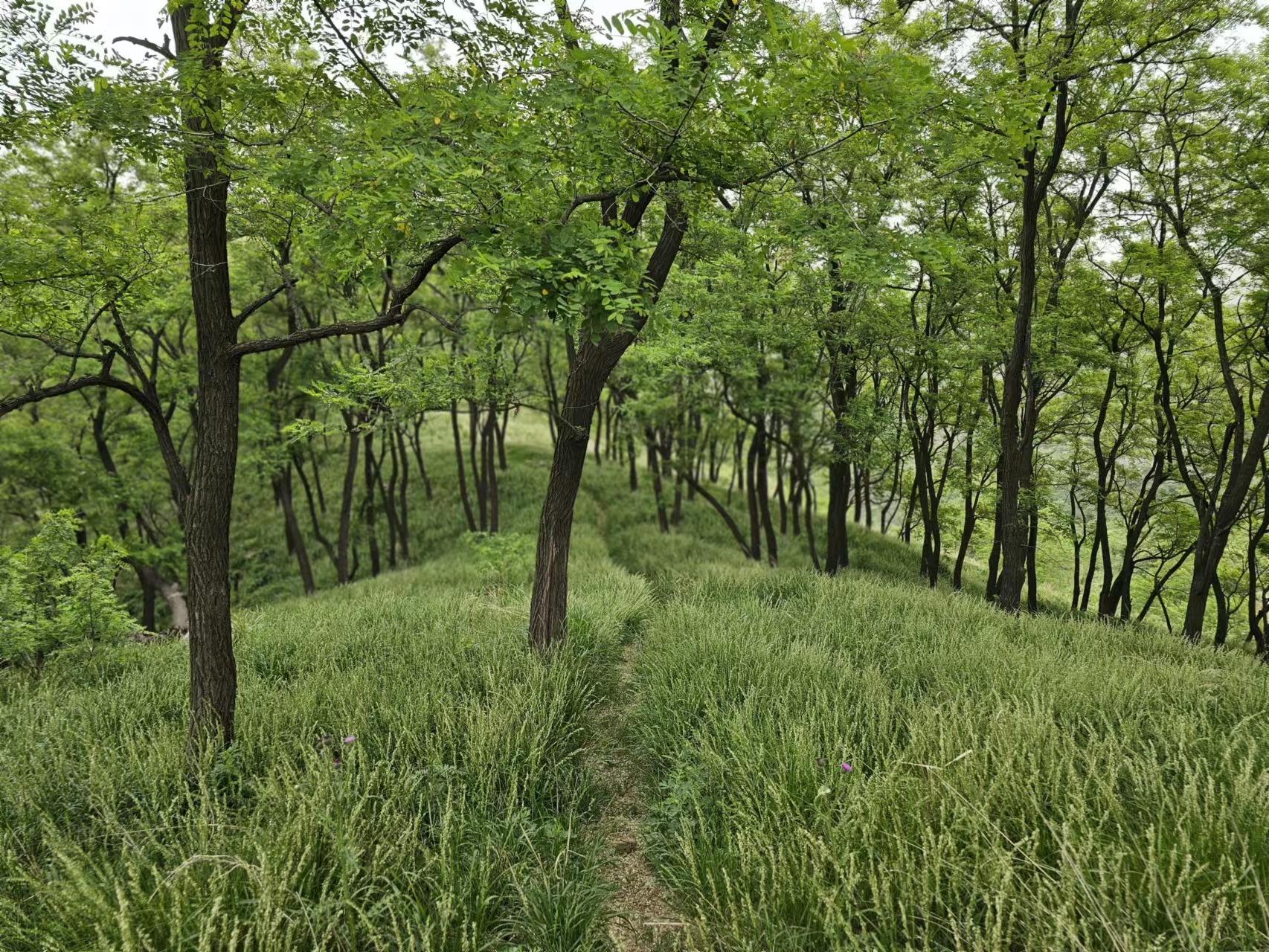 槐林里的草色嫩绿,齐刷刷的,有小腿一般高,像绿茸茸的地毯沿着漫坡往四处铺展开去。草坪中间有一条痕迹明显的东西向小路消失在绿油油的槐林尽头,颇有曲径通幽的意蕴,令人不忍遽去。同行的几位美女在草坪上拍照起来没完没了,那银铃似的欢声笑语让我们几个走在前面的驴友在100多米远的山顶上都能听得到。