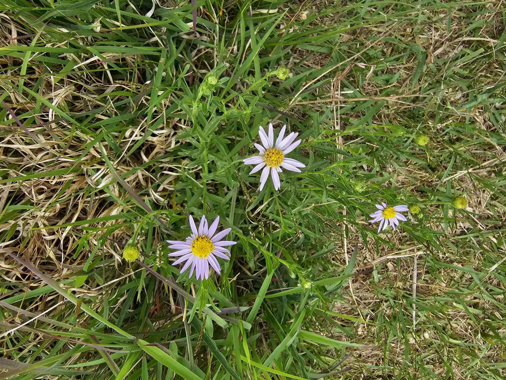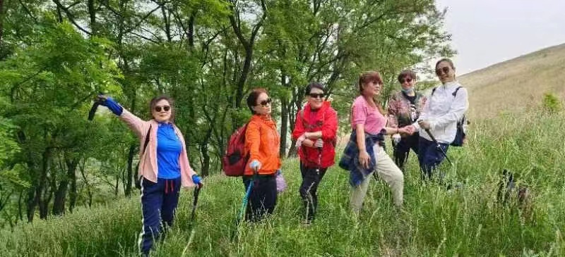 山坡上黄绿相间的草丛里,小路边,野花点点,摇曳多姿,陪伴了我们一路。她们多是一些淡紫色的狗娃花,橘黄色的苦菜花,还有成串的紫色丹参花,粉红色的刺刺菜花,洁白的绣线菊花等等,她们点缀的草原五色缤纷,生机盎然,煞是好看。爱花是人的天性,无论男女。有的驴友一路见到好看的野花就喜欢掐一些,于是有人就唱起上世纪九十年代流行的歌曲《路边的野花不要采》来调侃。我们一伙人大多数都是上世纪六七十年代出生的人,年龄相差不大,对这歌曲也不陌生,有的人就跟着起哄道:不采白不采,采了也白采!逗得大家呵呵大笑。大家排着一字形的队伍,像军人拉练似的,沿着草坡小路上上下下,一路欢歌,笑声不断。