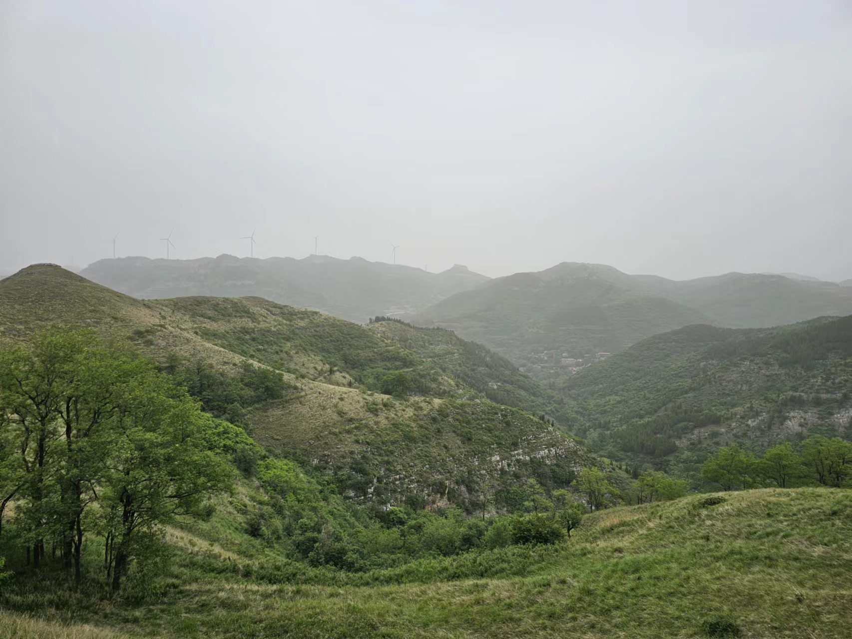 走出山林,爬上垭口,两面的山坡忽然空旷了起来,一棵树也没有,半黄半绿的草坡一望无际,尤为罕见,这就是西厢村闻名遐迩的空中草原了。凭着记忆,我们爬上了西面的山顶。起伏的群山上也不知道什么时候长出了一些“大风车”,这应该是近年来新兴的绿色能源设施,济南周边的区县山上也不少见。那巨大的叶片一辆载重汽车仅仅能拉一个,把它们运到山上再安装起来,太不容易了!没见过电力工人们是如何在山上安装这些巨无霸的,但对他们的聪明智慧我是深信不疑。山顶草原上有一条漫漫的羊肠小路弯弯曲曲地铺向远方,像诗一般意味深长。我们沿着小路往北走了一段,我觉得方向不对,便指引大家转向东侧的垭口槐林而去。