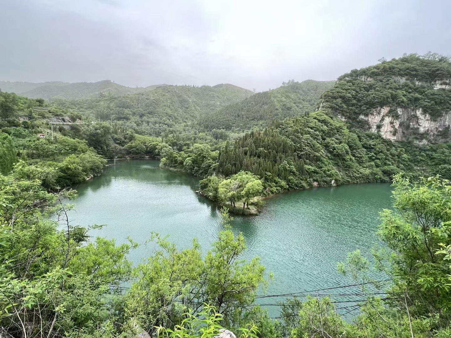 经过一道石门,再转过几道弯儿,便下到了镇门峪水库。只见一湖碧水呈“S”状沿着山谷蜿蜒伸展,一眼望不到头。湖水粼粼然,如翠玉一般醉人。靠山的湖边就是石壁,有的高点,有的低点,有的绿树干脆就与湖水牵上手,连在了一起。湖岸上面那些茂密的绿树,也不知道它们是不是黄栌,如果是,等到晚秋,这景色该是多么地震撼啊!现在的绿树倒影在湖里,近岸处一片墨绿,墨绿拽着中间的一片淡绿,拉着岸上的漫漫葱绿,连缀在一起,浓的浓,淡的淡,泛着油光,浑然天成,仿佛天底下都是绿的了。