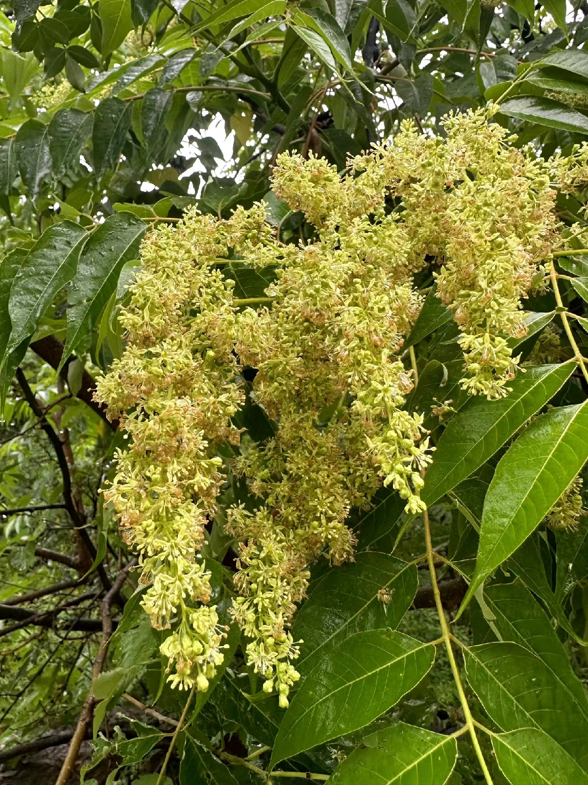 “天有不测风云”,刚刚还是无风无雨舒适凉爽的好天,转眼就是乌云密布雨滴啪啪了。也就几分钟的时间,上衣就渐渐湿透,害得我不得不跑到路边一处建筑下躲雨。可那“大长腿”却“风雨中,这点痛算什么”,任雨滴溅落脸颊,任雨水湿透衣衫,仍心无旁骛、超然世外般地一心采摘。我高声喊:留点给后面的驴友吧!她也无动于衷。除了采摘,这一刻,世界似乎与她无关了。