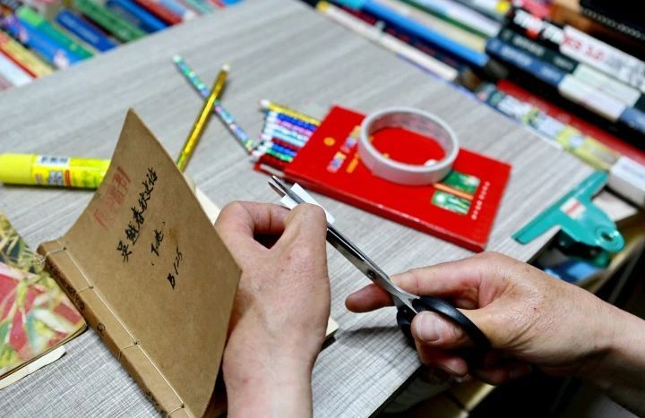 遇到有破损的书籍,郭大伟会拿出工具修补。