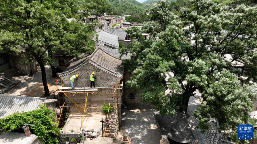 6月7日,在河北省石家庄市井陉县小梁江村,施工人员对村中古建筑进行修缮(无人机照片)。骆学峰 摄