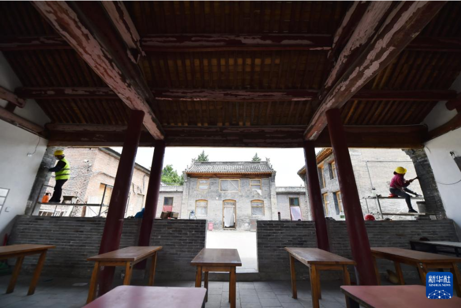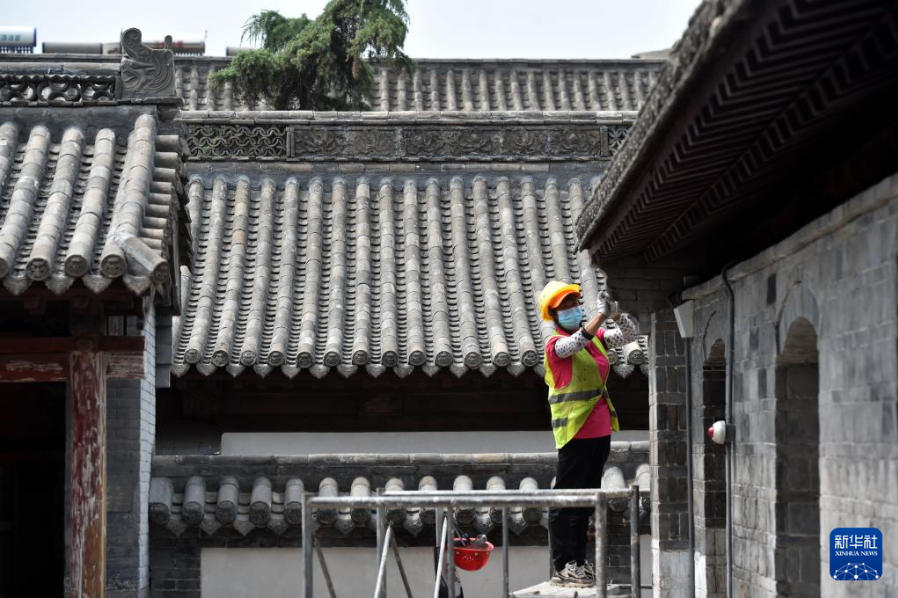 6月7日,施工人员在河北省石家庄市井陉县天长宋古城内的皆山书院进行古建筑修缮。骆学峰 摄
