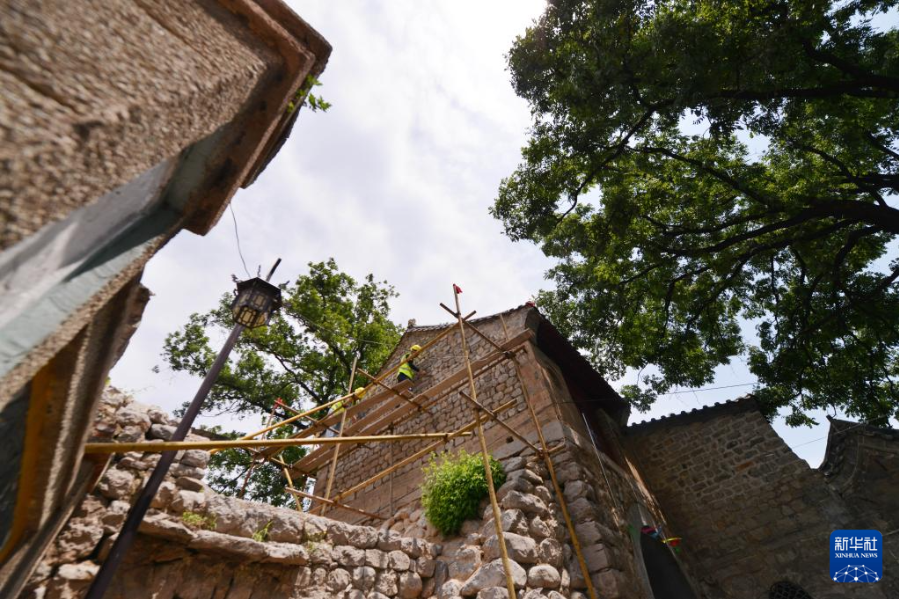 6月7日,施工人员在河北省石家庄市井陉县小梁江村进行民居修缮。骆学峰 摄