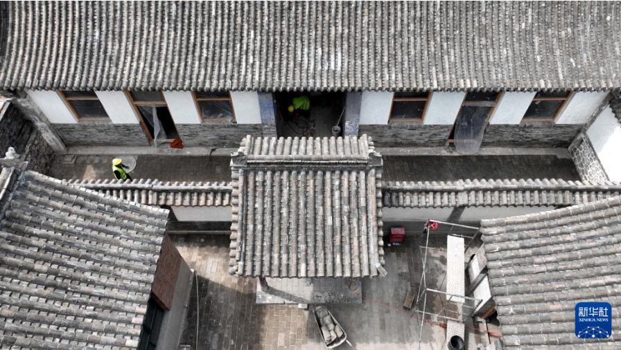 6月7日,施工人员在河北省石家庄市井陉县天长宋古城内的皆山书院进行古建筑修缮(无人机照片)。骆学峰 摄