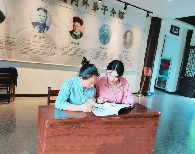 笔者(右)与文化园讲解员李霞(左)学习《张裕钊书法集》