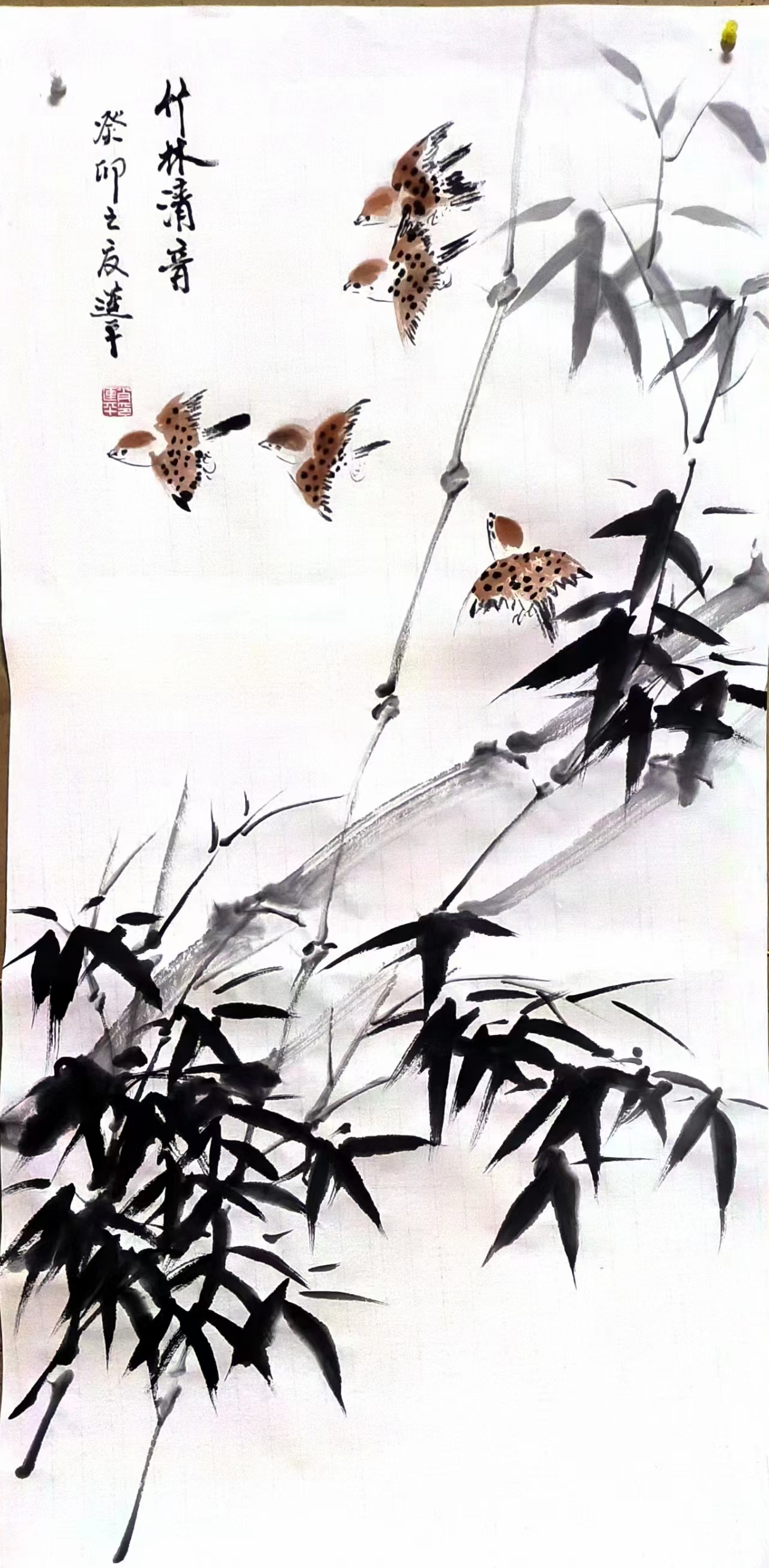 一片竹林清翠幽,成群丽鸟叫声稠。
