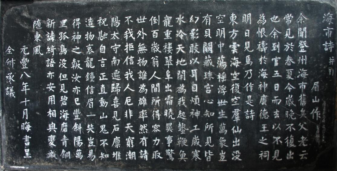 苏轼在诗文方面取得了登峰造极的高度,令后人难望其项背,蓬莱阁得此佳作是仙阁之幸事。且借由苏轼诗文的影响,后世之文人墨客皆来蓬莱阁观海赏景、借物咏怀、挥毫泼墨,其中部分作品被摹勒上石,共同构成了蓬莱阁文化的重要组成部分。目前已知最早的苏轼《海市诗》碑刻现保存在卧碑亭内的卧碑背面,勒于金皇统年间(1141—1149年)。但海市诗卧碑碑文因世人的捶拓和海风的侵蚀,致使字迹漫漶、模糊,故清代翁方纲临摹重新勒石存于苏公祠内。现如今保存在苏公祠西墙壁上的翁方纲临苏轼《海市诗》刻石,亦使古阁于仙风绝俗中平添几分韵彩,故有赵朴初题留:“真临仙阁凌虚地,来读苏公海市诗。”