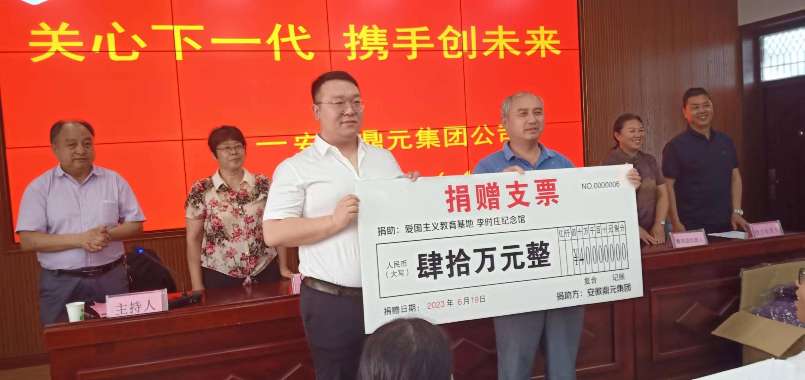 安徽鼎元集团公司总经理李加祥首先向淮北市红色爱国主义教育基地、淮北市红色革命历史博物馆暨李时庄纪念馆;传承和弘扬中华优秀传统文化、教习、展示并研学非遗传统文化的古睢书院;城关中学特困生等分别捐助40万元、10万元、1万元的善款。