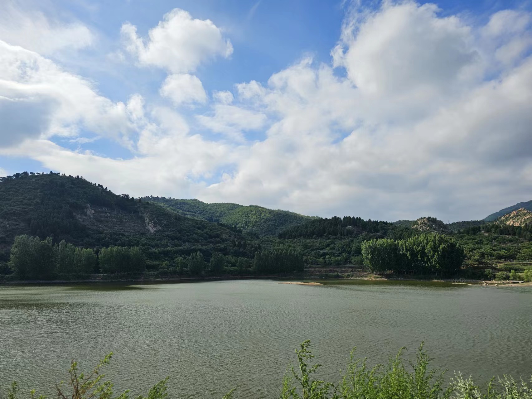 到了坡里村,因为村容村貌变化太大了,我就不知道往哪里走了。驴友自由哥下车向一位村民问路。村民指指村南的大山说,那里就是。我们沿着柏油路出了村庄往南行驶。当年崎岖不平的土路变成了宽敞平坦的柏油路,我们驾车一霎就到了坡里水库边上。