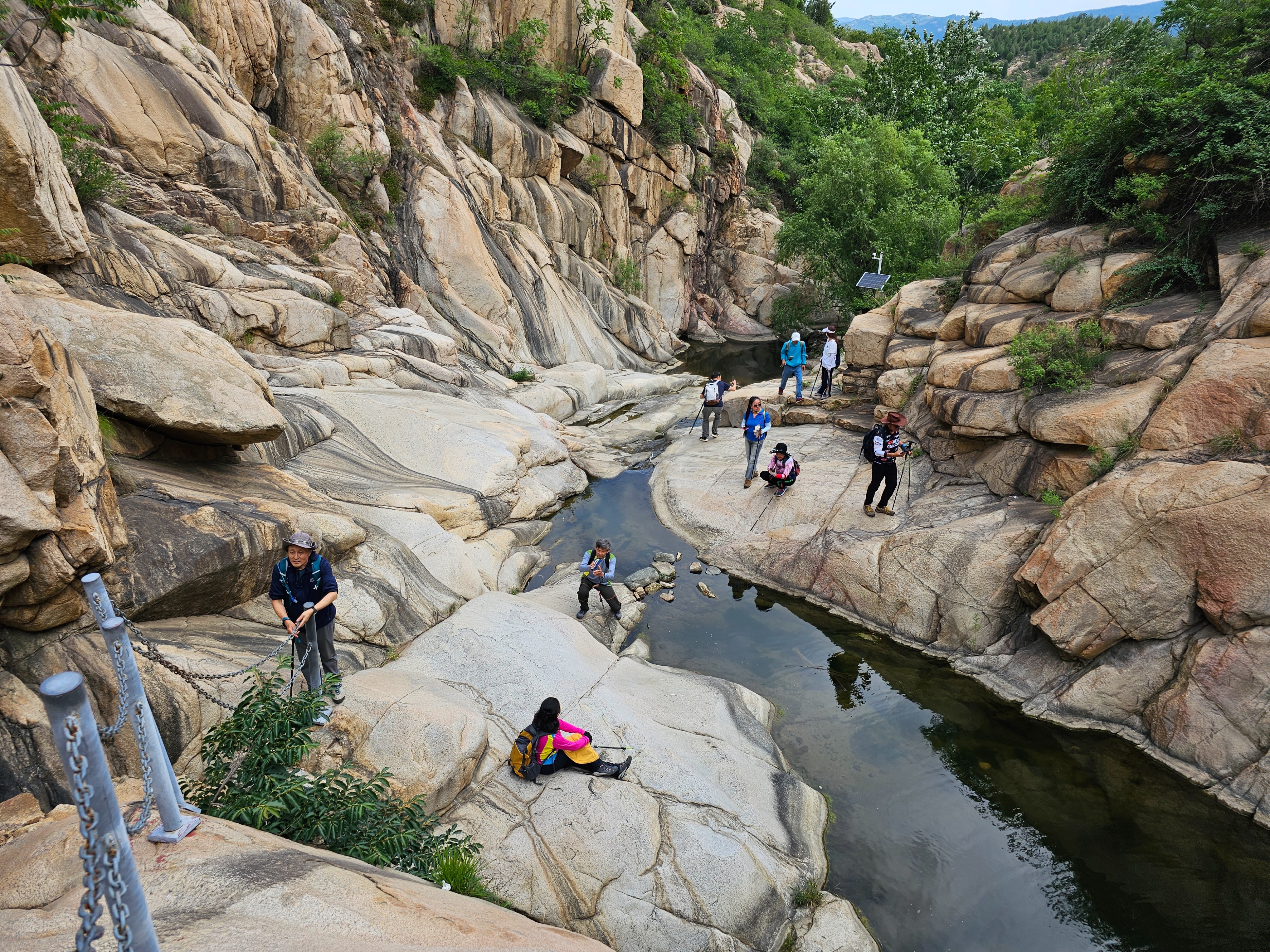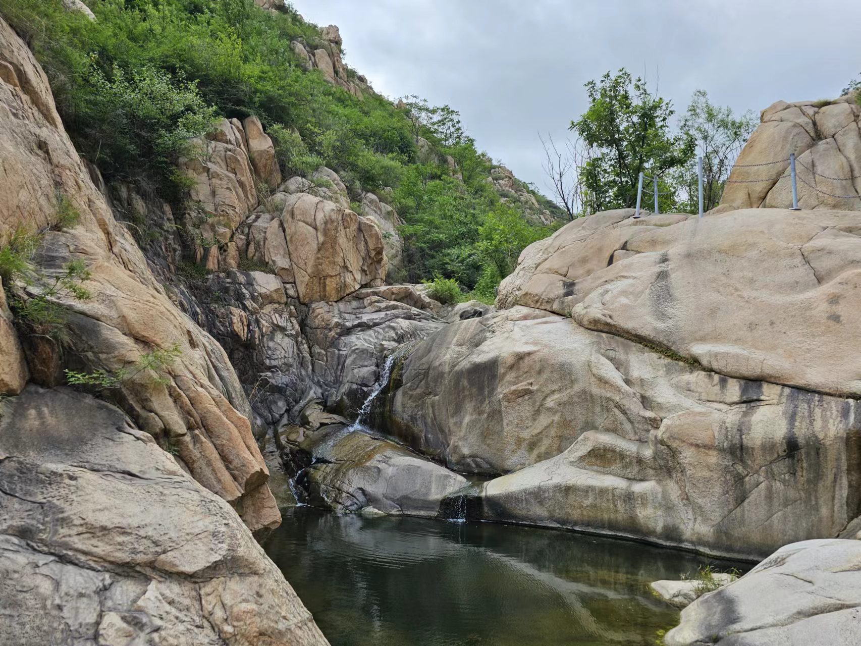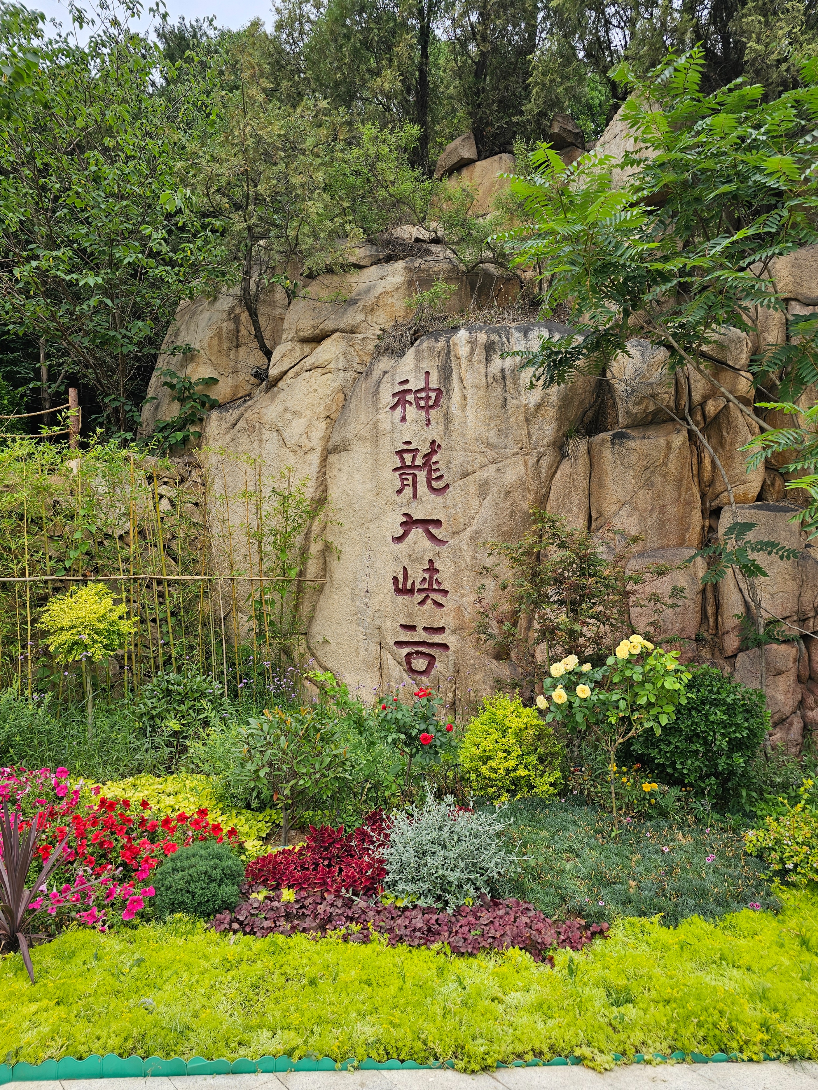 也不知道什么时候太阳躲进了厚厚的云彩里去了,天空顿时乌蒙蒙的,像要下雨的样子。这夏日的泰山一带,真是变化多端,刚才还晴空万里,阳光灿烂,不过一霎就变了天,让人有点措手不及。原来谷里的坡坎,游人爬上去不大方便,现在都做了修整,危险之处还装了栏杆,这就安全可靠得多了。大家一边眼观奇石,一边耳听流水,不觉一公里长的大峡谷就走到了尽头,就像在桂林漓江的画中游一般,让人回味无穷。大家在刻有“神龙大峡谷”五个大字的石壁下面留了影儿然后上山。