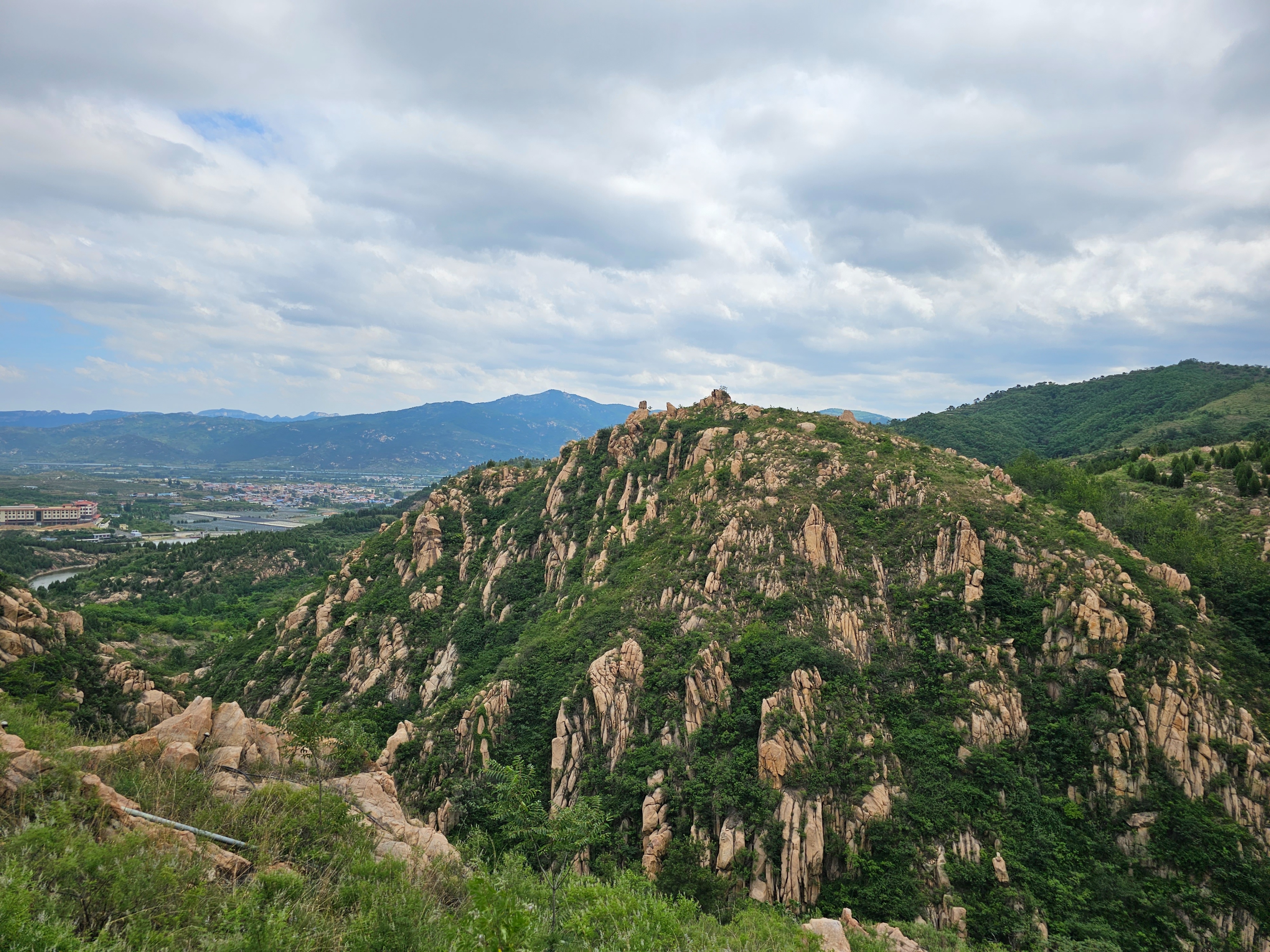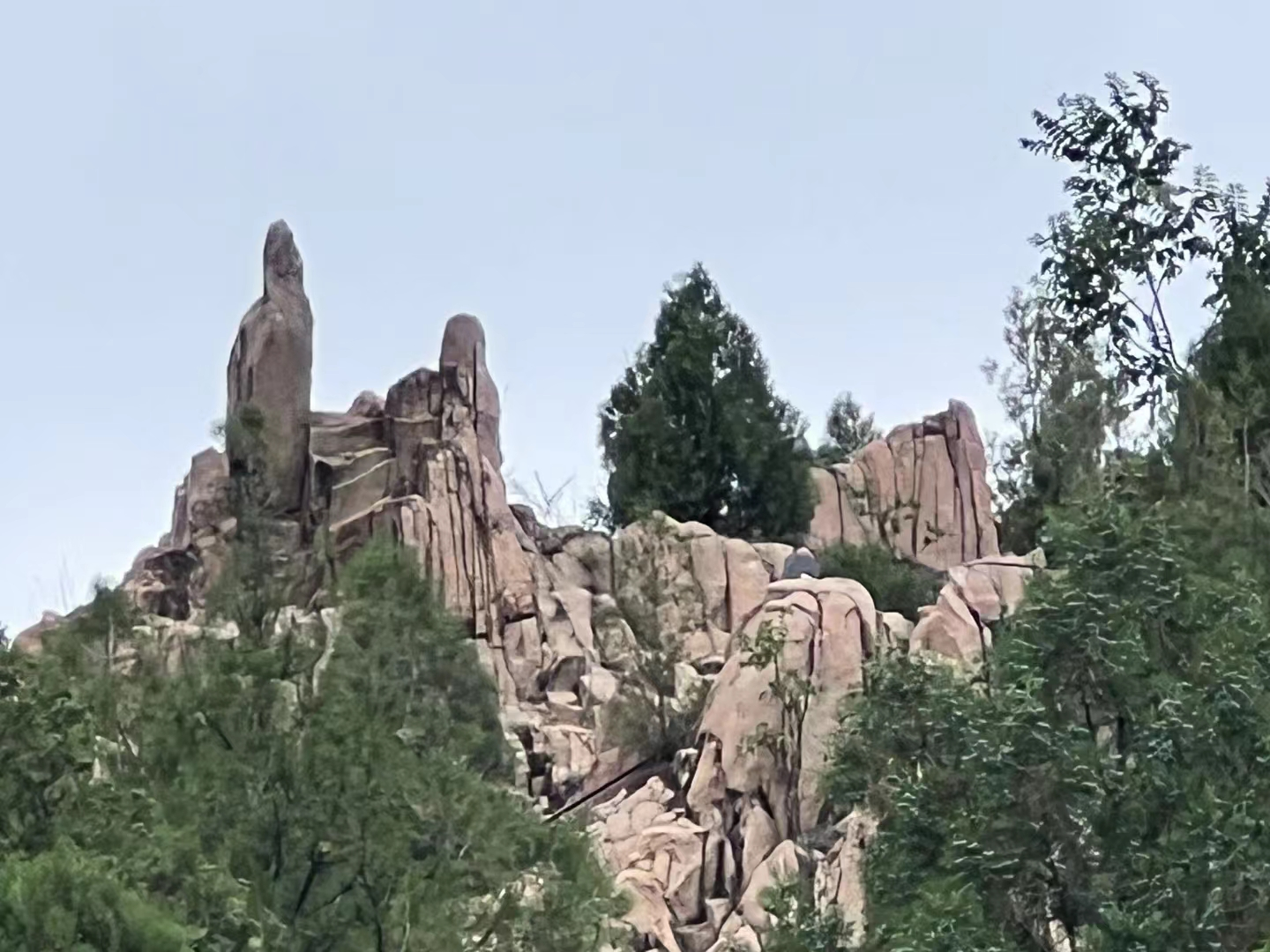 站在山顶,往东看,薄雾里巍巍泰山雄伟高大直插云天,轮廓鲜明,近在眼前;往西北看,坡里水库那一泓碧波,荡漾如玉,分外秀丽;往西看,刚才我们还在观景台看峡谷对面的山峰光景,现在则是换了位置隔着峡谷西望观景台风光;往南看,逶迤的青山下就是东西门村以及九女峰书房等观光游玩项目。山下公路上的车辆络绎不绝,游客人来人往。我们在山峰上合了个影儿,见时间已经12点了,便开始下山。