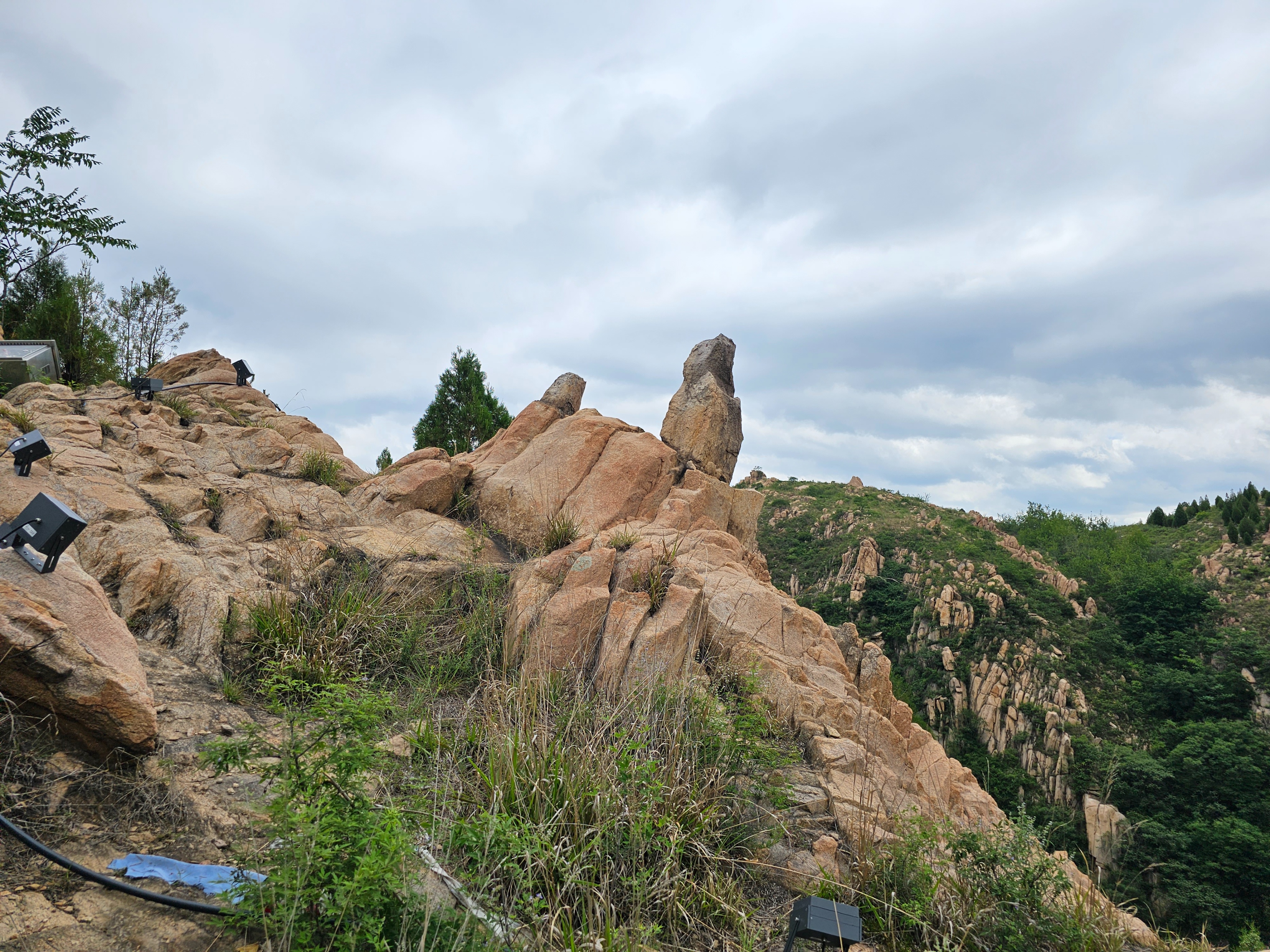 我们绕山转了一圈儿,又下到了峡谷。经过一段林荫野路,沿着石壁上的羊肠小径,往北前进。石壁全是那种黑石头,应该是著名的泰山黑玉石,可见这里的泰山元素并不少见。