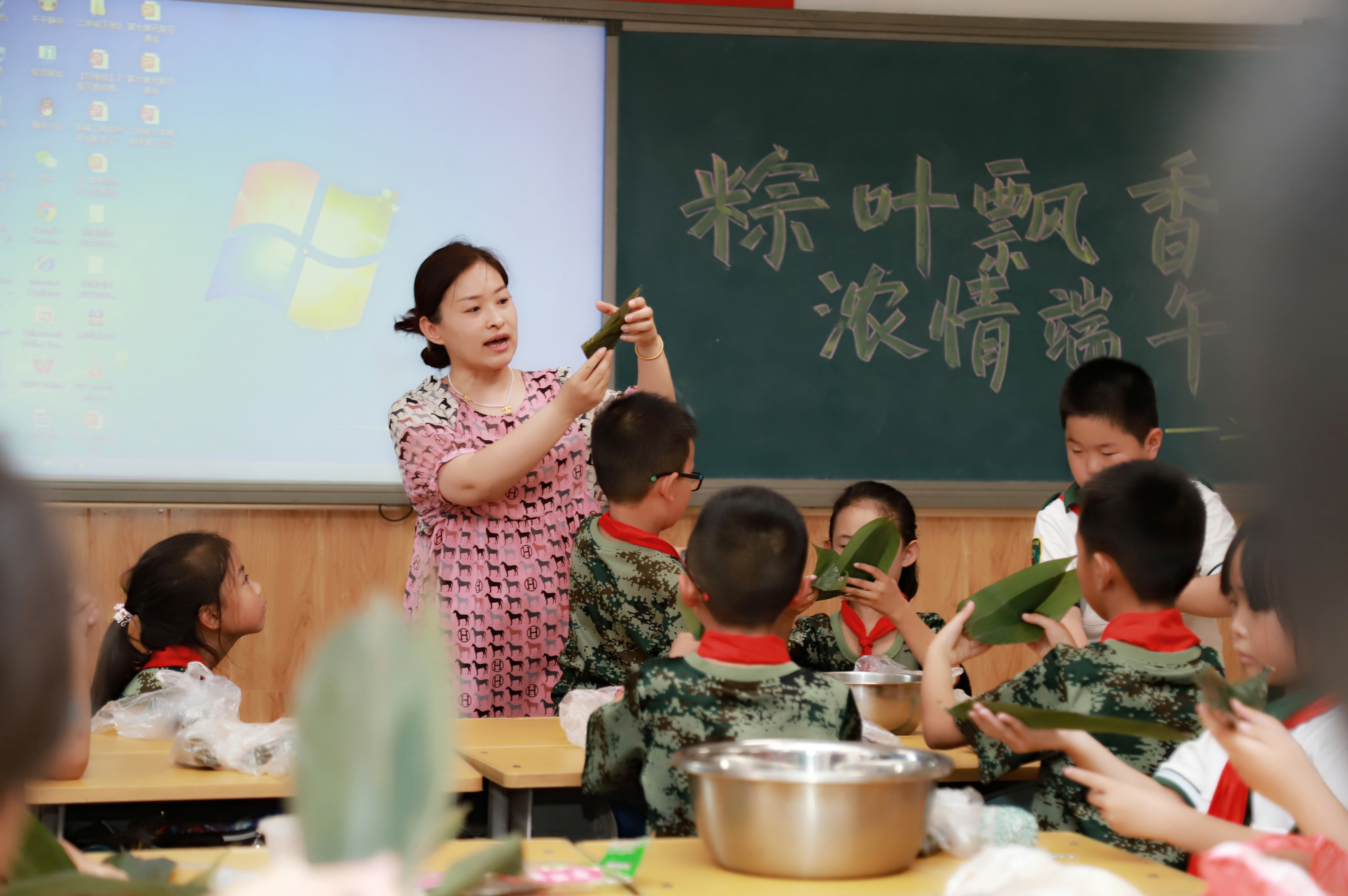 跟老师学习包粽子。