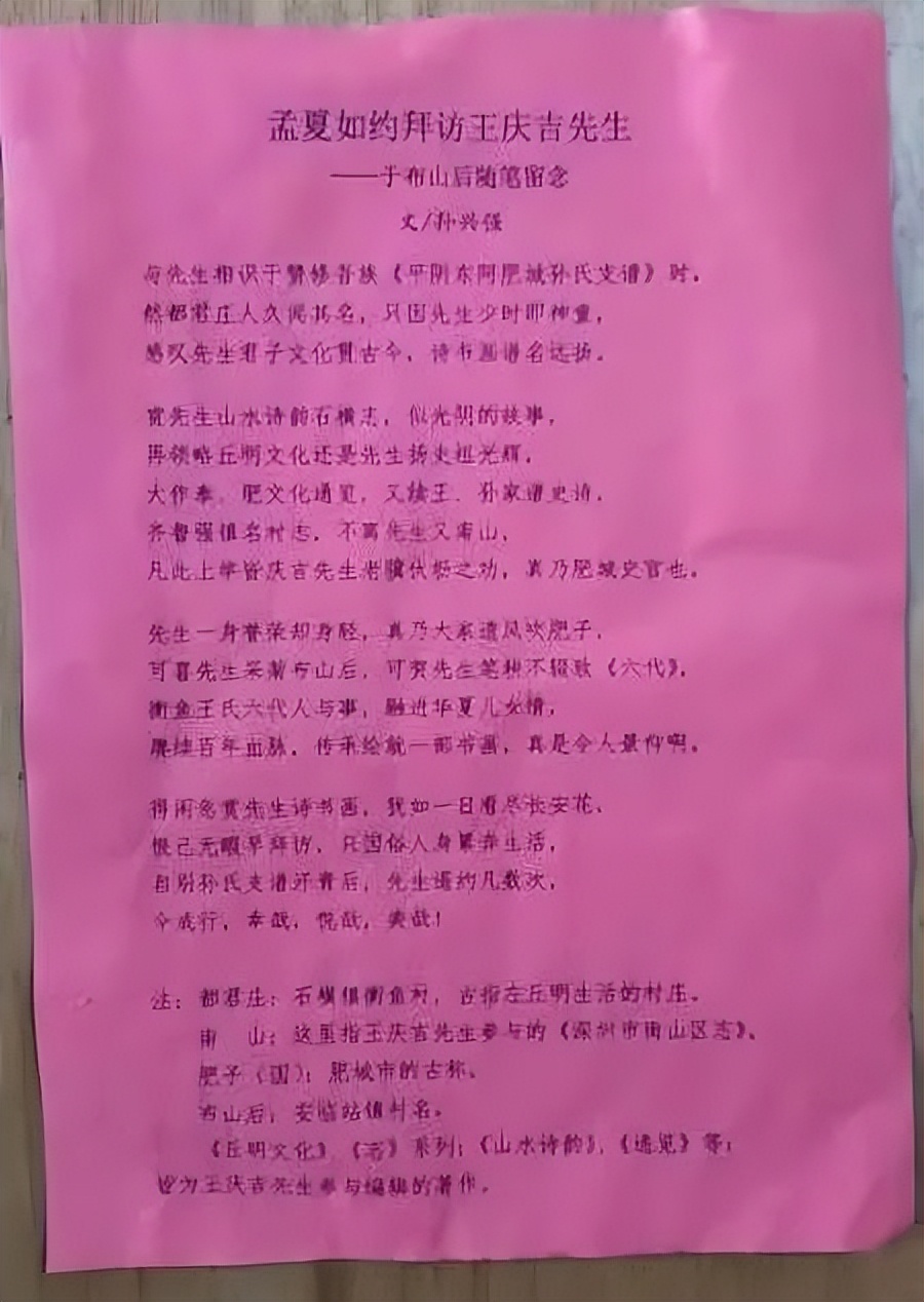 我爷俩逛逛玩玩,喝水谈心,很是投机,从左丘明文化,到日常工作,简直啦不够。谈够两三个小时,我给他新书《衡鱼王氏六代书画集》,他辞别回去,握手再见。他走后,看到他的礼品上放着一张红纸,拿下细看,一首自由诗,夸我的内容。看来,他还是挺内向,感到写的还不行。好!我不往文章上写了。