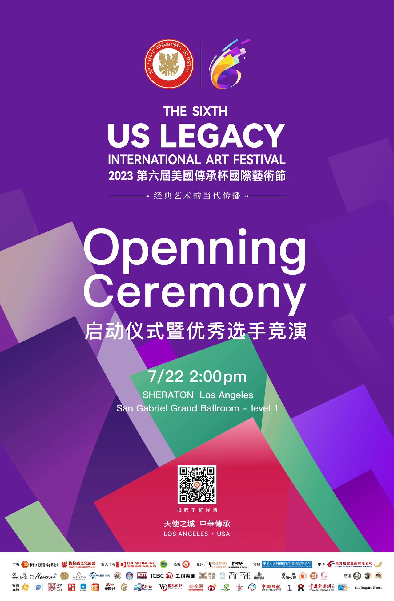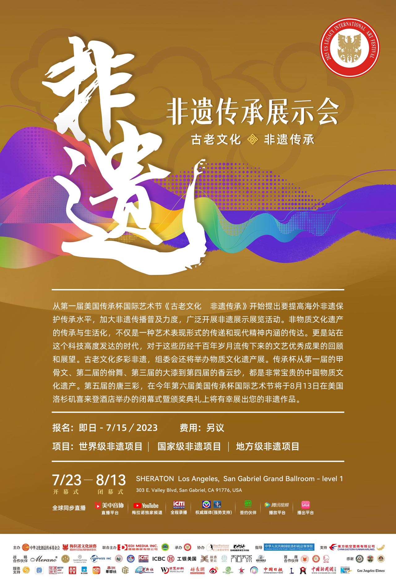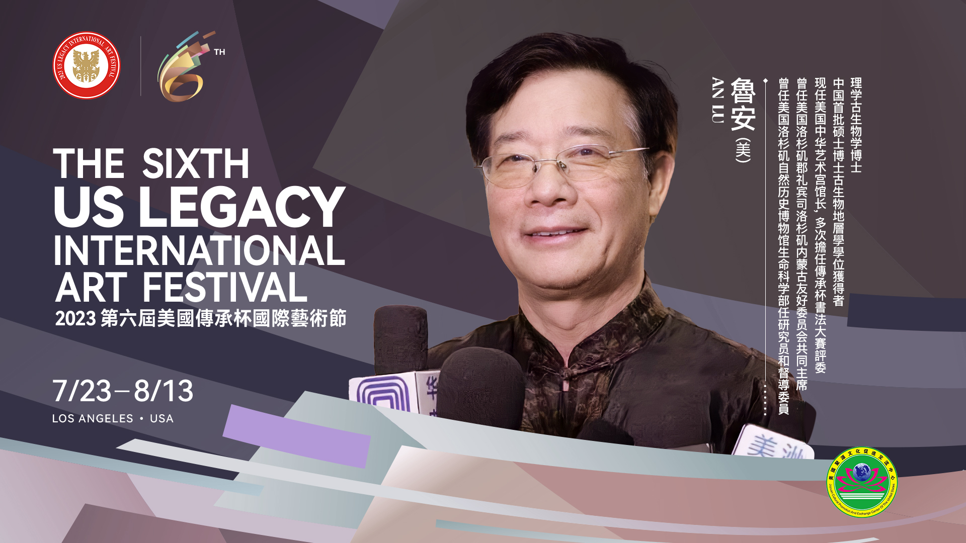 第六届美国传承杯国际艺术节即将于7月29日到8月13日在美丽的天使之城洛杉矶隆重举行, 这次活动包括2023年第六届艺术节启动仪式暨优秀选手竞演, 现场(线下)的传承杯的各项艺术大赛, 古老东方文化艺术之美, 非遗传承展示之汇, 以及第六届艺术节的闭幕仪式和颁奖典礼. 盛况空前, 精彩可期.