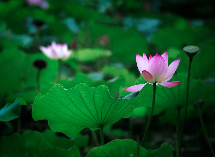 晚风携雨莲塘过,电闪雷鸣。打叶声声。花落蛙鸣白鹭惊。