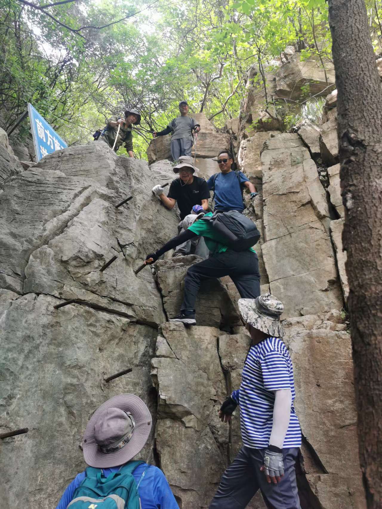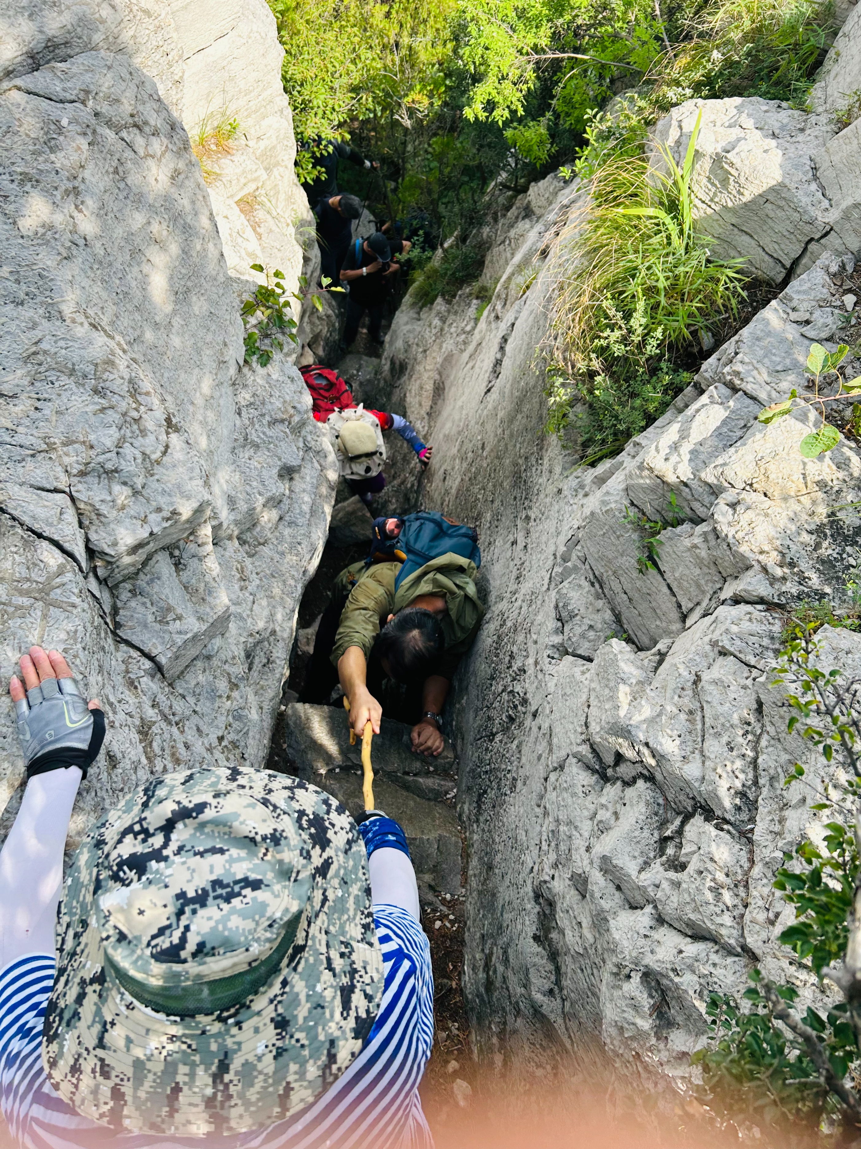 所谓的“一线天”,就是一道大石缝,呈50度斜坡,长约十几米,宽仅容一人。有人用红油漆在石壁上写了”一线天“三个大字,看油漆部分剥落的样子说明此字已经存在很久了。石缝里有两三道障碍,坎坷难行,大家相互拉拽着,依序往上攀登。最上面一道坎较高,接近山顶,一个人独自爬上去不大容易。我终于爬到了那道坎下,高哥从上面伸下来一根木棍要拽我上去。我抓住木棍的一头,高哥就要拉,我连忙说,你别慌,脚还没找到踩踏点,用不上力呢!待脚踩稳了,我说,好了。高哥身体后倾一用力拽我上去。也有不需要别人拉拽,自己爬上去的,这与个人体力、技巧有关,与年龄似乎关系不大。驴友老丁从”一线天“左侧石壁徒手攀登上去,无论其体力还是胆量都令人敬佩,一般人没把握都绝不敢冒险。