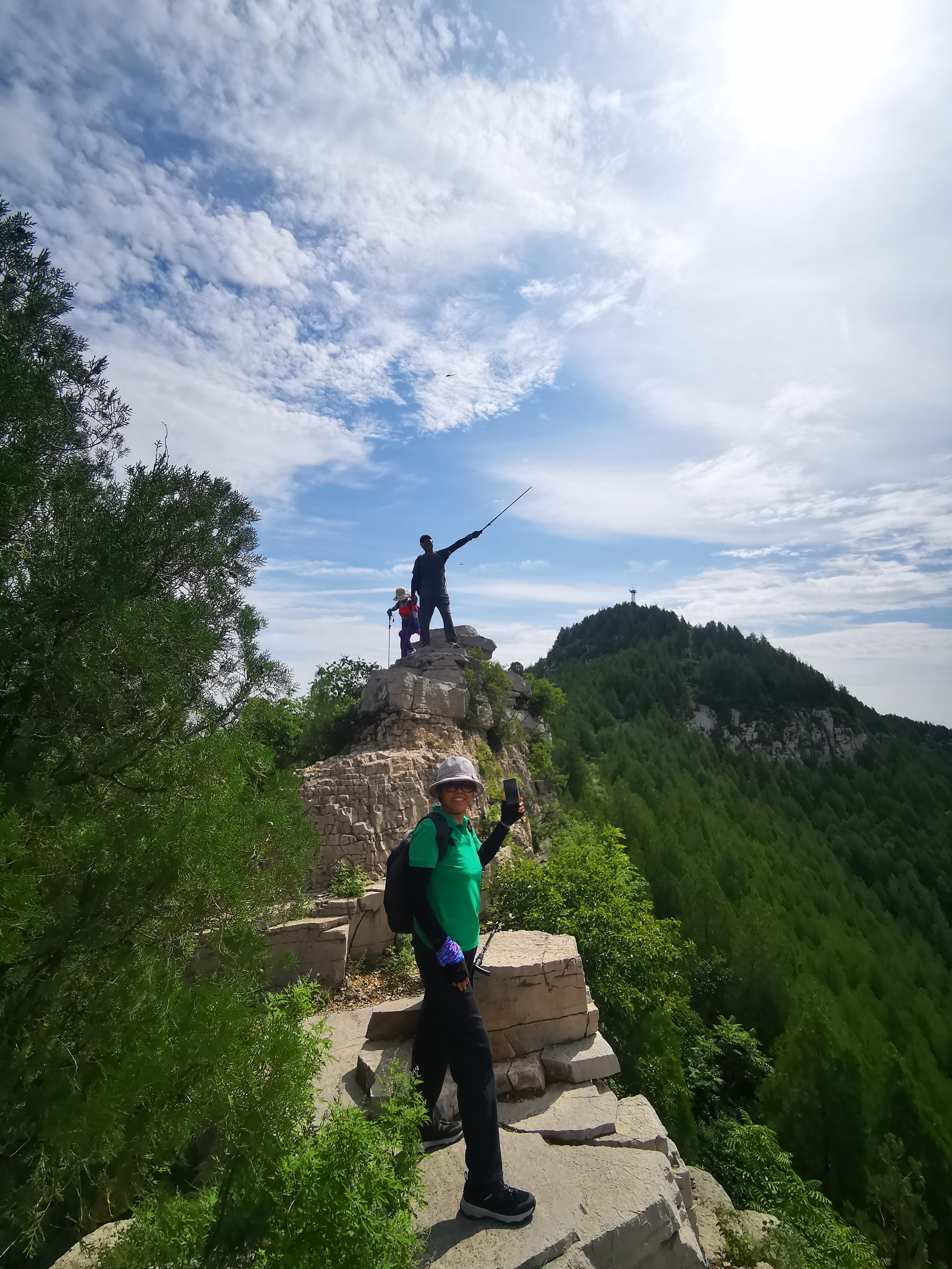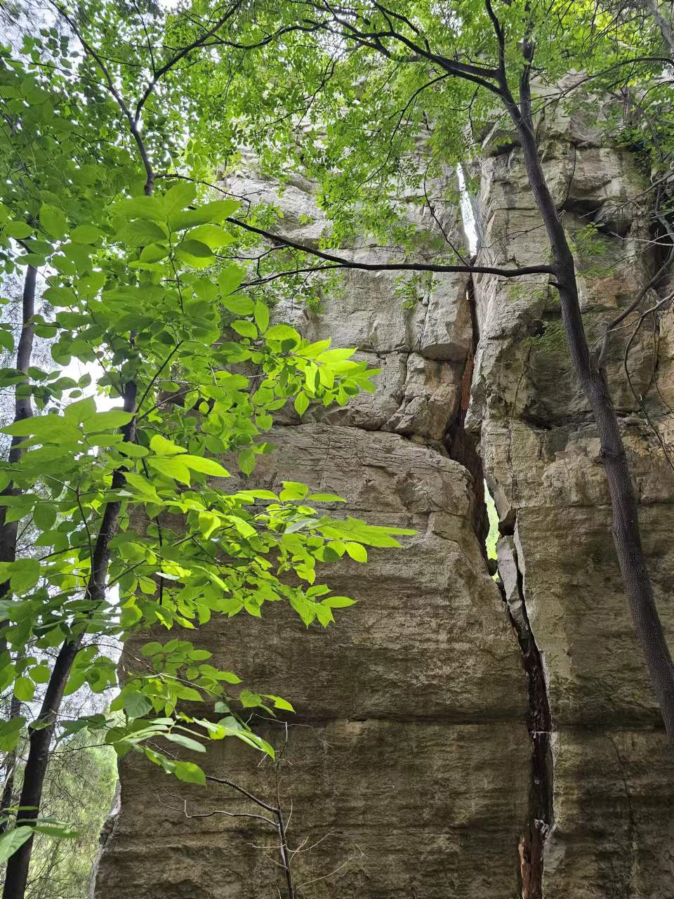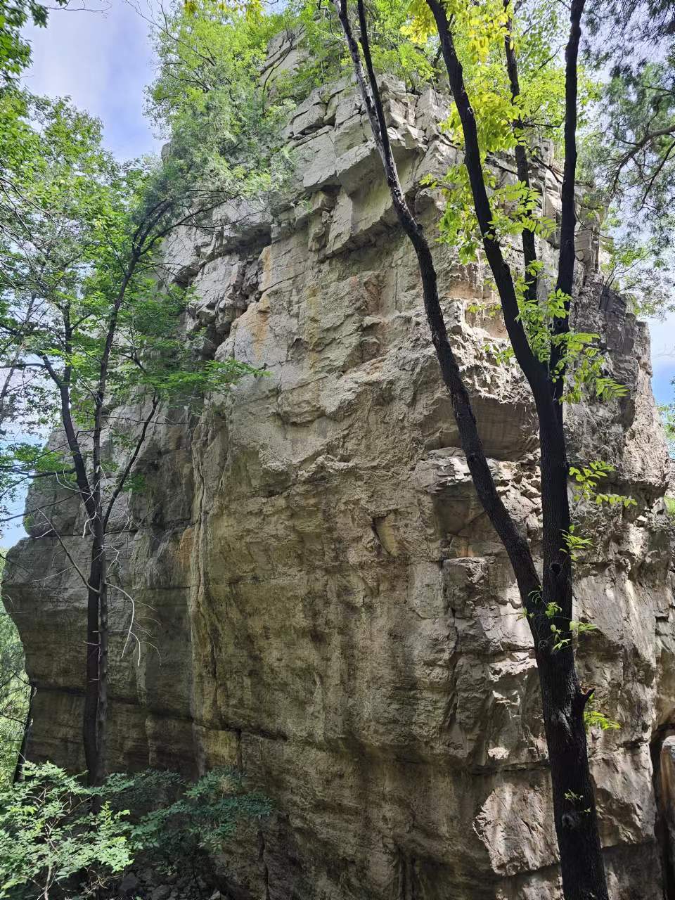 山顶上小路两边多是黄栌树,眼下正值盛夏,黄栌长势正旺,叶子一片墨绿。可以想见,待到暮秋,经过霜打,这些黄栌叶子就该红的红黄的黄了,到那时山上就更美了。我们沿着山脊,在灌木丛里又爬了两个小山头,才来到了“一线天”下面。