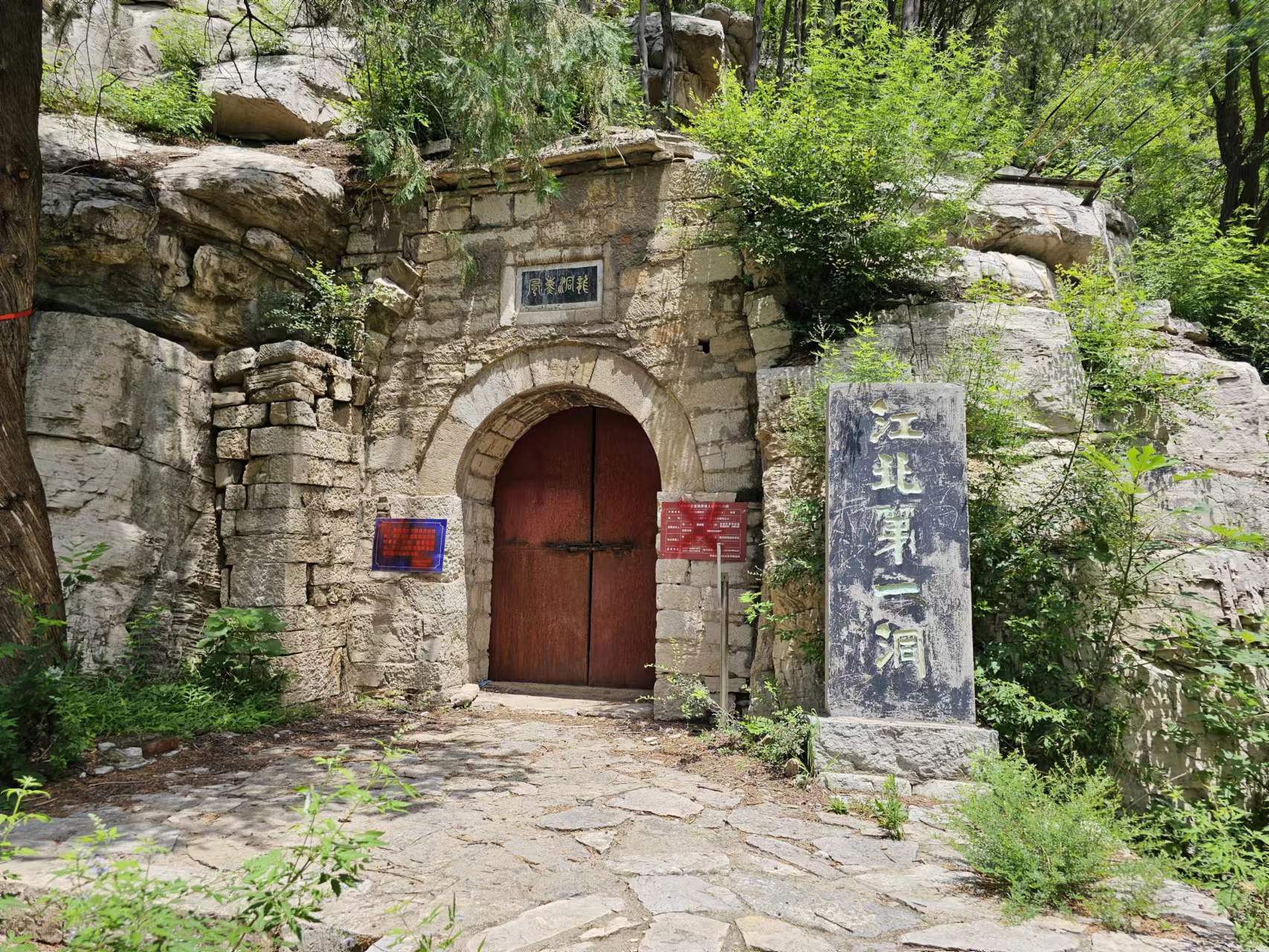 洞口青石砌就,门口右侧树立一通石碑,上面刻有“江北第一洞”五个大字。可惜现在景区不知道什么原因已经关闭,龙洞也被铁将军把门,不能进去参观了。洞口有块不锈钢牌匾,介绍“蟠龙仙洞”情况,现摘抄部分内容如下:蟠龙仙洞又名“东龙洞”。蟠龙仙洞是一历史悠久的天然石灰岩洞穴,据地质学家考证认定,此洞在远古造山运动时期随着地壳变化而形成。洞分上中下三层,目前可以游览的中间层深达千余米。洞内钟乳石千姿百态,奇形怪状,在江北实属罕见。更为奇特的是洞中有中华独有的佛隐寺,被誉为“江北第一洞”……