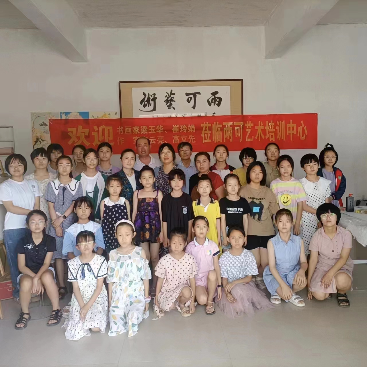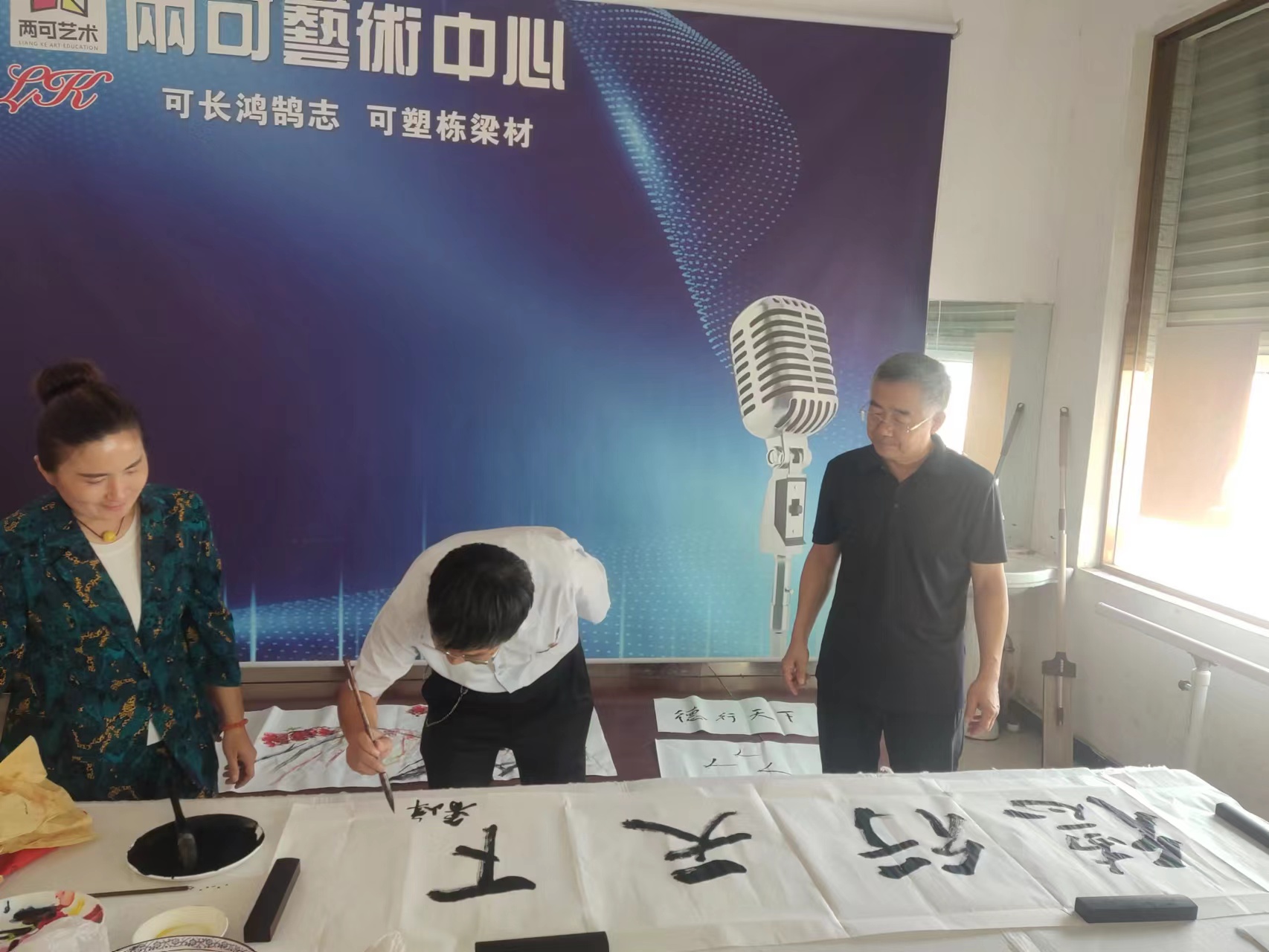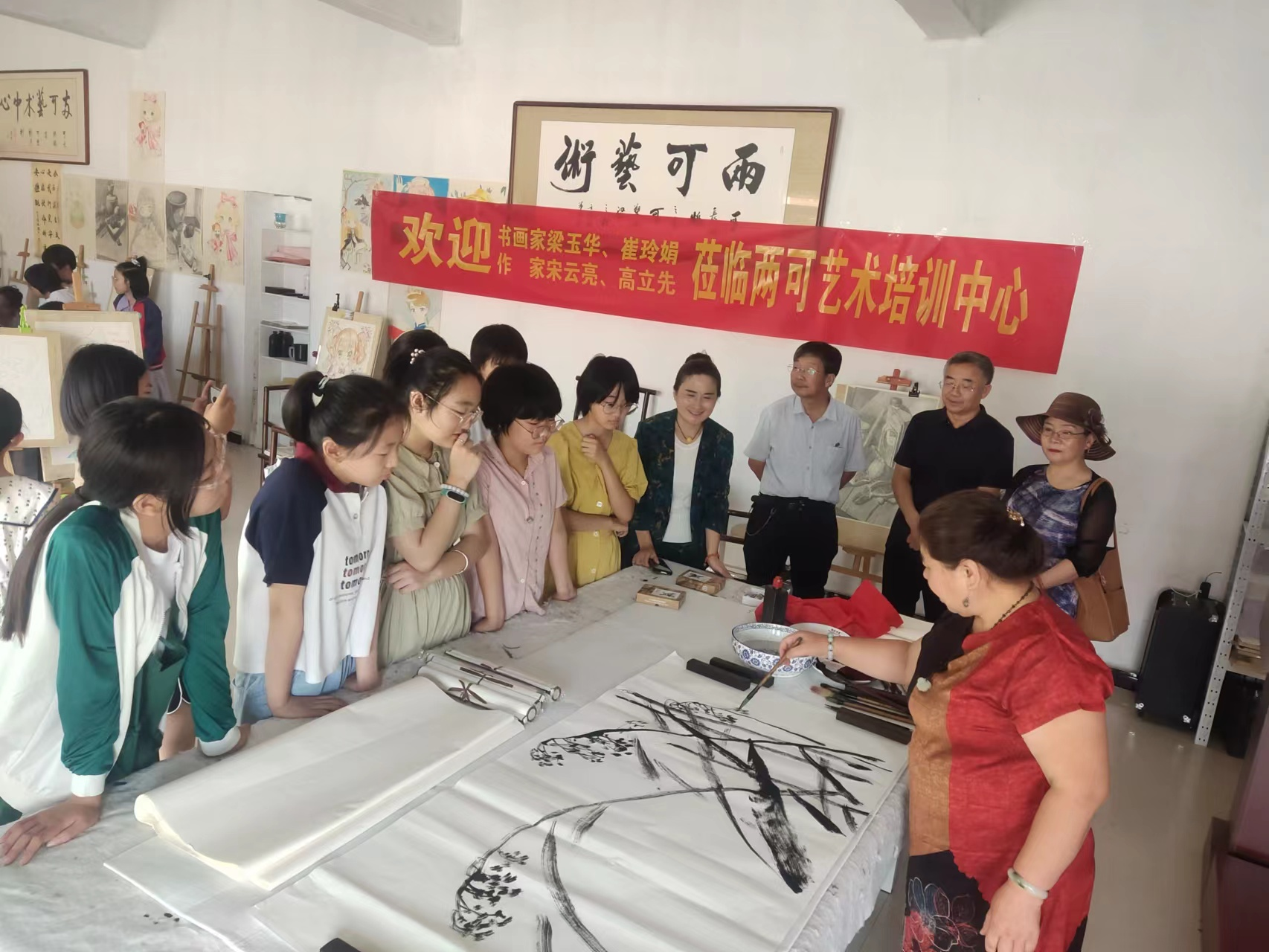 随后,夏津、清河两地的作家、书画家们进行了交流座谈,并现场为同学们书写、画画,传授技艺。