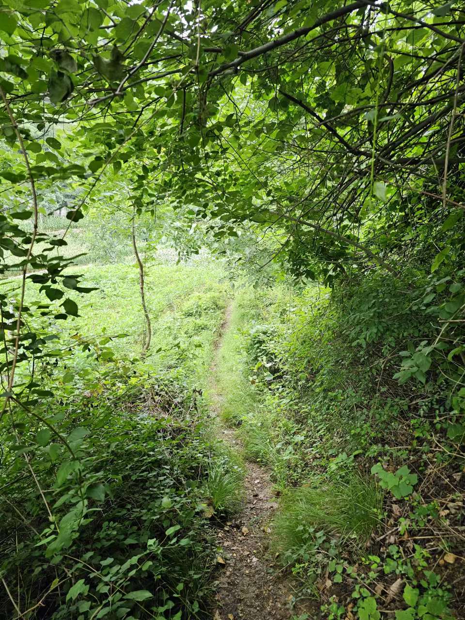 下山的路跟预判得差不多,还有点黏湿,好在石头是干的,就多了几分安全感。羊肠小路与水沟已为一体,可能是昨夜里刚下过的大雨冲刷的小路沟沟壑壑的,崎岖难行,而且路边就是悬崖峭壁,一旦滑倒,后果难料。可以肯定,现在这条小路除了驴友之外,大概村民已经很少有人走了。因为山下的玉河泉一带村庄到拔槊泉等地都通了柏油路,盘山公路把各个村庄都连接了起来,交通已经十分便捷了。村民们也都有了私家车或者摩托车,走亲访友,赶集买卖基本上都是以车代步了,因此这些连接村与村之间的山野小路的荒废就成为必然的了,这也是社会主义新农村建设的具体成果吧。