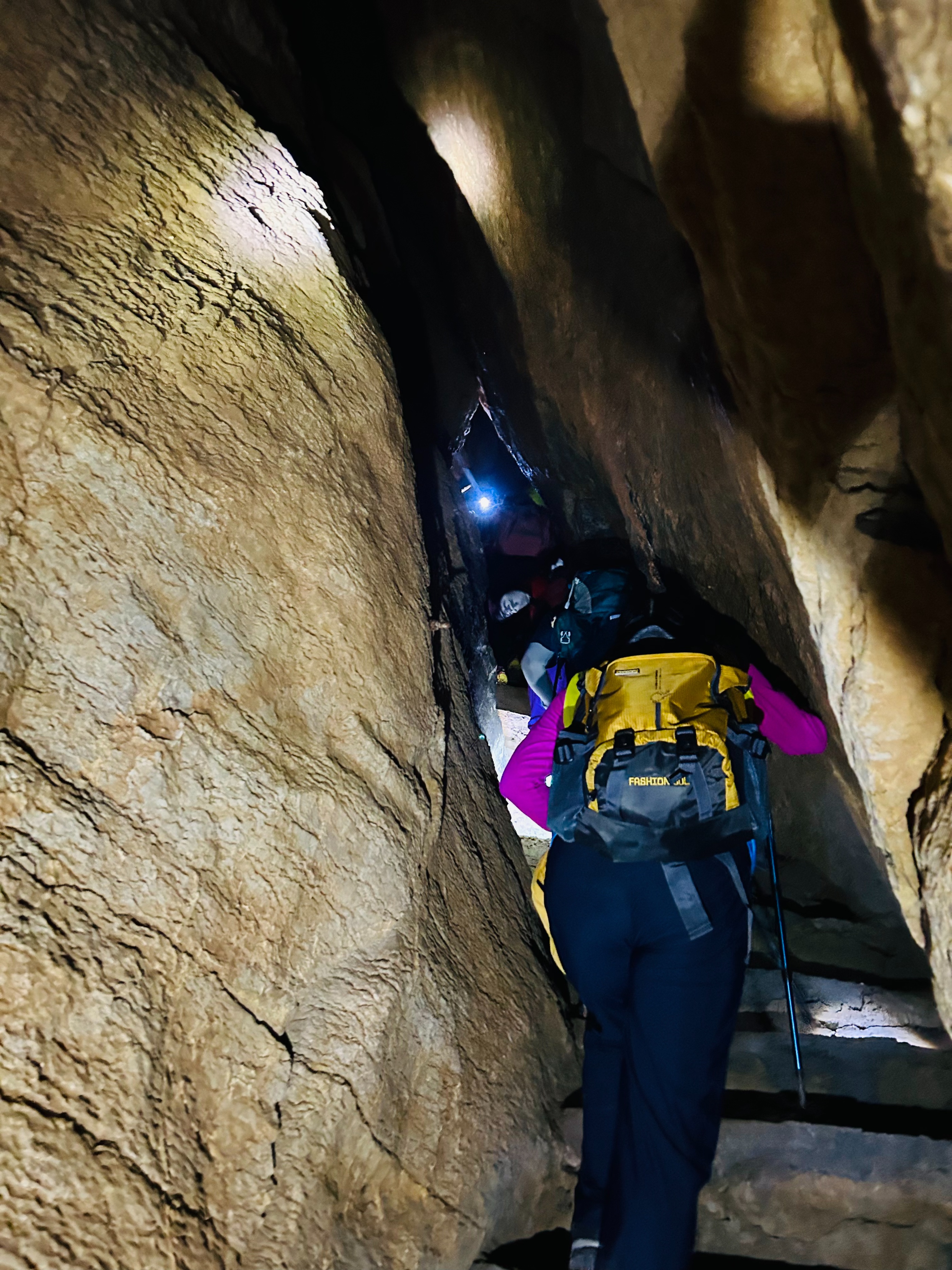 洞底温度较低,有点冷,大家没有久留,瞅几眼便沿着台阶出洞。台阶修在一道巨大的斜缝之中,宽度仅容一人,如天梯一般陡峭。我的双肩包不断地被两边石壁摩擦着,哧啦哧啦地响,有点心疼。也不记得爬了多少级台阶,终于上到了洞口。