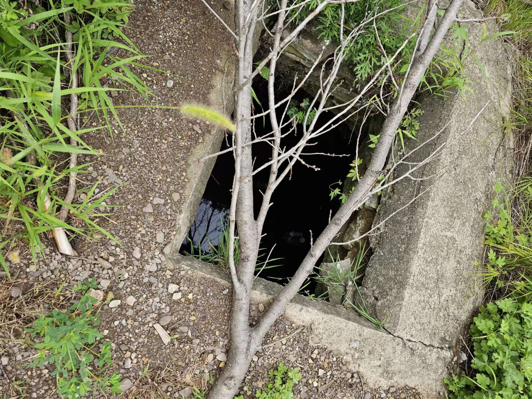 距离垭口十几米处有眼旱井,估计是农民雨季存水浇庄稼的。井深3米左右见水,水面上飘着塑料瓶等污物,水多深不知。有人放了一棵枯树枝盖在井口上,这显然是好心人所为。经常在山上行走,许多危险之处,如有的石壁上踩踏处过浅踩不牢,就会有人凿之;有的垫脚石不稳当,有人稳之;有的地面有坑凹,有人填之;有的关键岔路口,有人挂有指路牌……可见社会上还是好人多啊!
