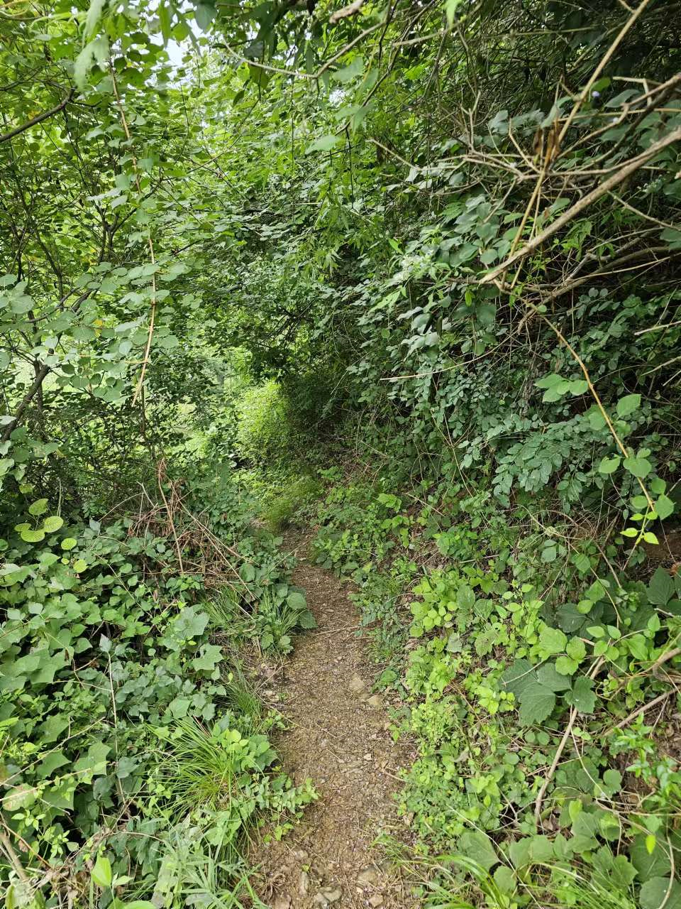 小路一直沿着悬崖边往前延伸,到中间地带,灌木丛十分茂密,且很多倒伏严重,挡住我们的去路。我一手拨拉着灌木,还得低头弯腰,注意脚下的乱石杂草,只能慢慢地行进。由于刚下过雨,小路还有点湿滑,而路右边稀拉的灌木下面就是万丈深崖,危险系数大大地增加了。前面走过去的驴友就及时提醒后面的人:脚下踩稳,抓牢灌木!大家小心翼翼地通过了这段灌木丛,顺利抵达垭口。