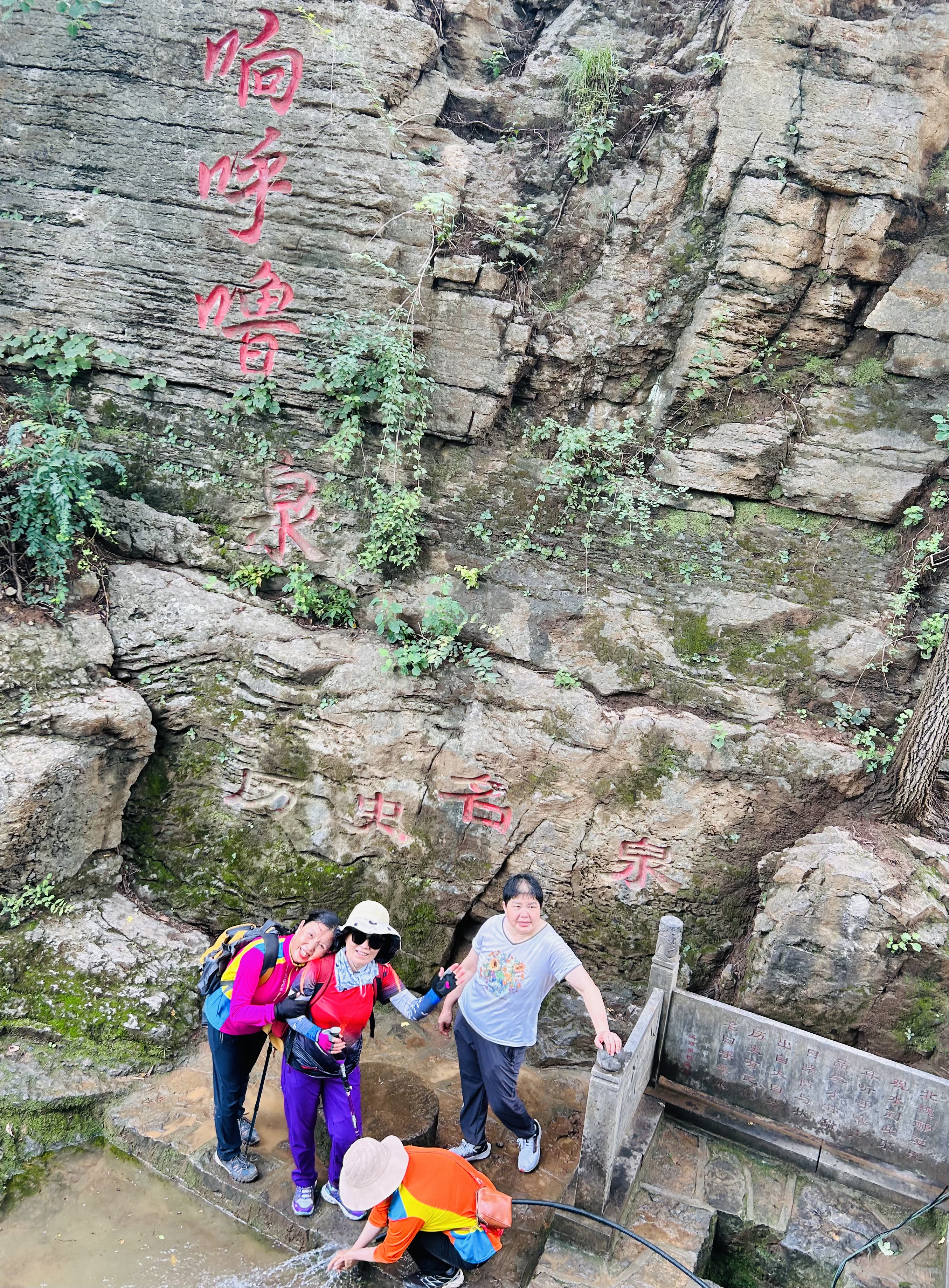 出了洞,大家在松林里休息。这时,凉风适时地轻轻抚来,颇为清爽,也算个小小的惊喜吧。大家补充了水,分食了各自带的水果,然后向下一个景点——拔槊泉出发。