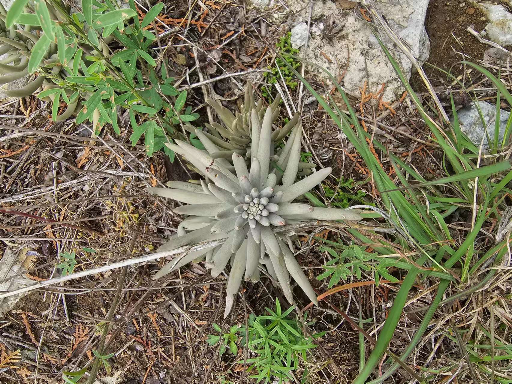 通往拔槊泉的小路就在悬崖边上,一直到远处的垭口。这条小路显然是古道,是过去玉河泉一带的百姓往来西营的必经之路。我刚收好水杯,喜欢在山上跟我探讨花草的驴友书亭在前面喊我,老牛,你过来看看,这是棵什么?我走近一看,原来是棵多肉植物,我说,这不是老没牙子吗?书亭说,这是胶东方言的叫法,它的学名叫瓦松。因这植物喜欢长在瓦房上面,而且像松树的样子,因此就叫这名了。记得小时候,我们小伙伴们上山拾草、剜野菜,常常寻找那些肥嫩的老没牙子吃,其略酸微甜的口感,很受小伙伴的欢迎。有小伙伴说,老没牙子吃多了会把牙掉没了,也不知道真假,但从此没有人再敢多吃了。那时候都不知道它还是一味中药材,专治痔疮的。