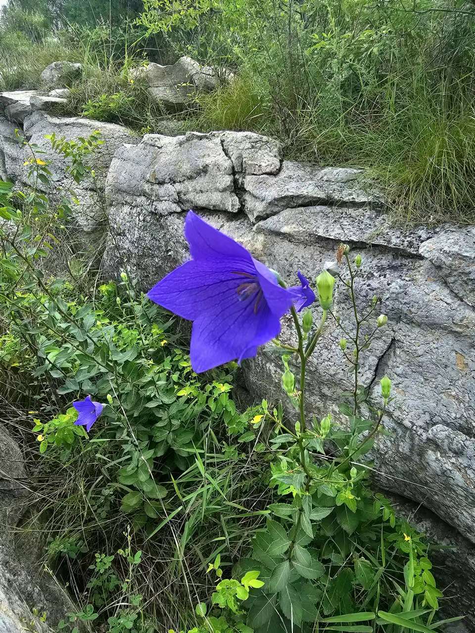 我刚准备走路,忽然又见到路边有一棵紫色野花十分鲜艳,惹眼,像紫色的铃铛似的,以前从没见过,就觉得很稀奇。书亭驴友已经走远了,我就用手机拍照,幸好有信号,搜出的信息告诉我是桔梗。我知道桔梗是一味中药材,但却不认识,想不到今日又有新的收获。桔梗根晒干了可以入药,有镇咳、消炎、祛痰的功效,还可以治疗痢疾呢。
