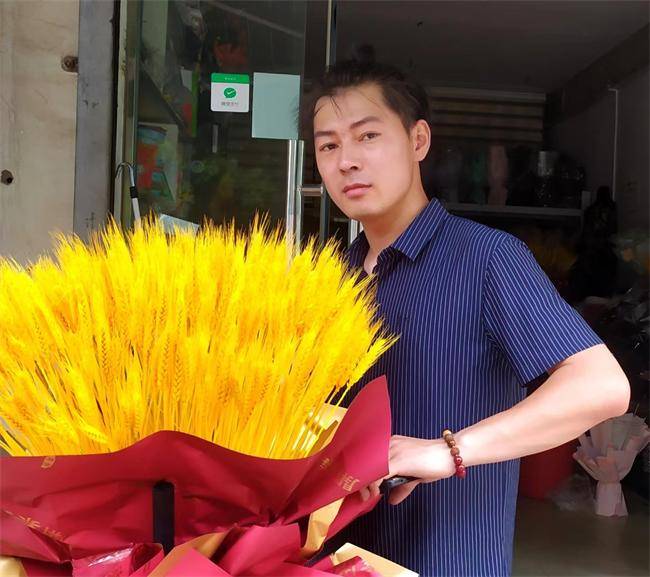 为办出自己的花坊特色,他的母亲、岳父岳母、妻子是很好的参谋,支持帮助他到郑州、广州学习深造,掌握插花高效技能,他通过学习,丰富了知识,增长了专业技能,亲手为花坊制作的产品种类也多了起来,红玫瑰、绿玫瑰、香槟、发财树、天堂鸟、黄金麦穗,各种鲜花、婚庆花车等,应有尽有。从此,为做好花坊工忙,服务好用户。天天忙得不能按时吃饭,连个星期天,节假日都没有。虽然有些苦累,心里可常是乐开了花。