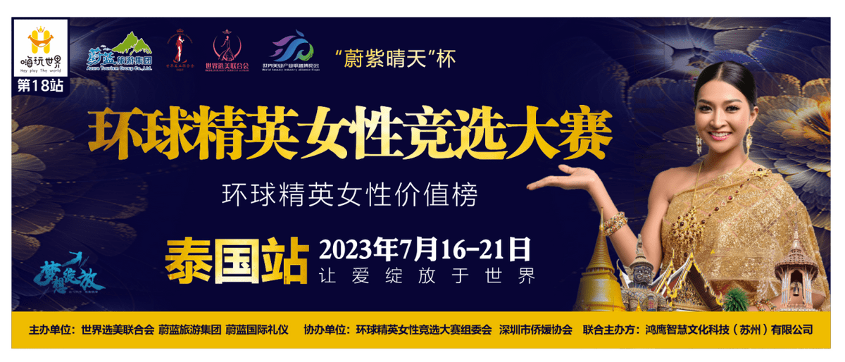 2023年7月16-21日,世界选美联合会、蔚蓝旅游集团携手深圳侨媛协会等机构进行开展中泰文化交流,开启“嗨玩世界”第18站:“蔚紫晴天”杯环球精英女性竞选大赛泰国站。