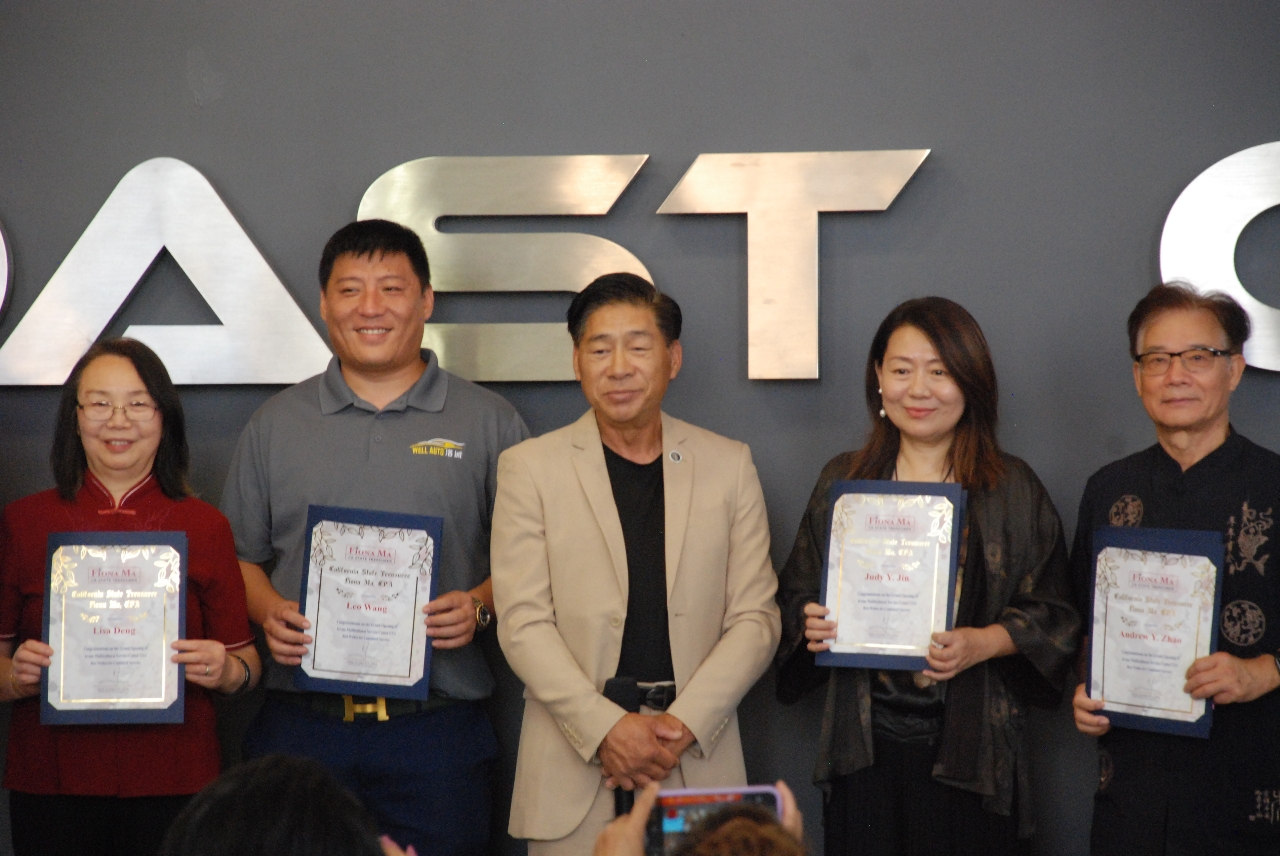 在熱烈的掌聲中, 中國駐洛杉磯總領事館王太鈺文化參贊首先致詞, 他對多元文化服務中心的成立表示熱烈的祝賀. 加州財政部長馬世雲的代表並向LEO WANG, JUDY JIN, 魯安和LISA DENG頒發了表彰狀.