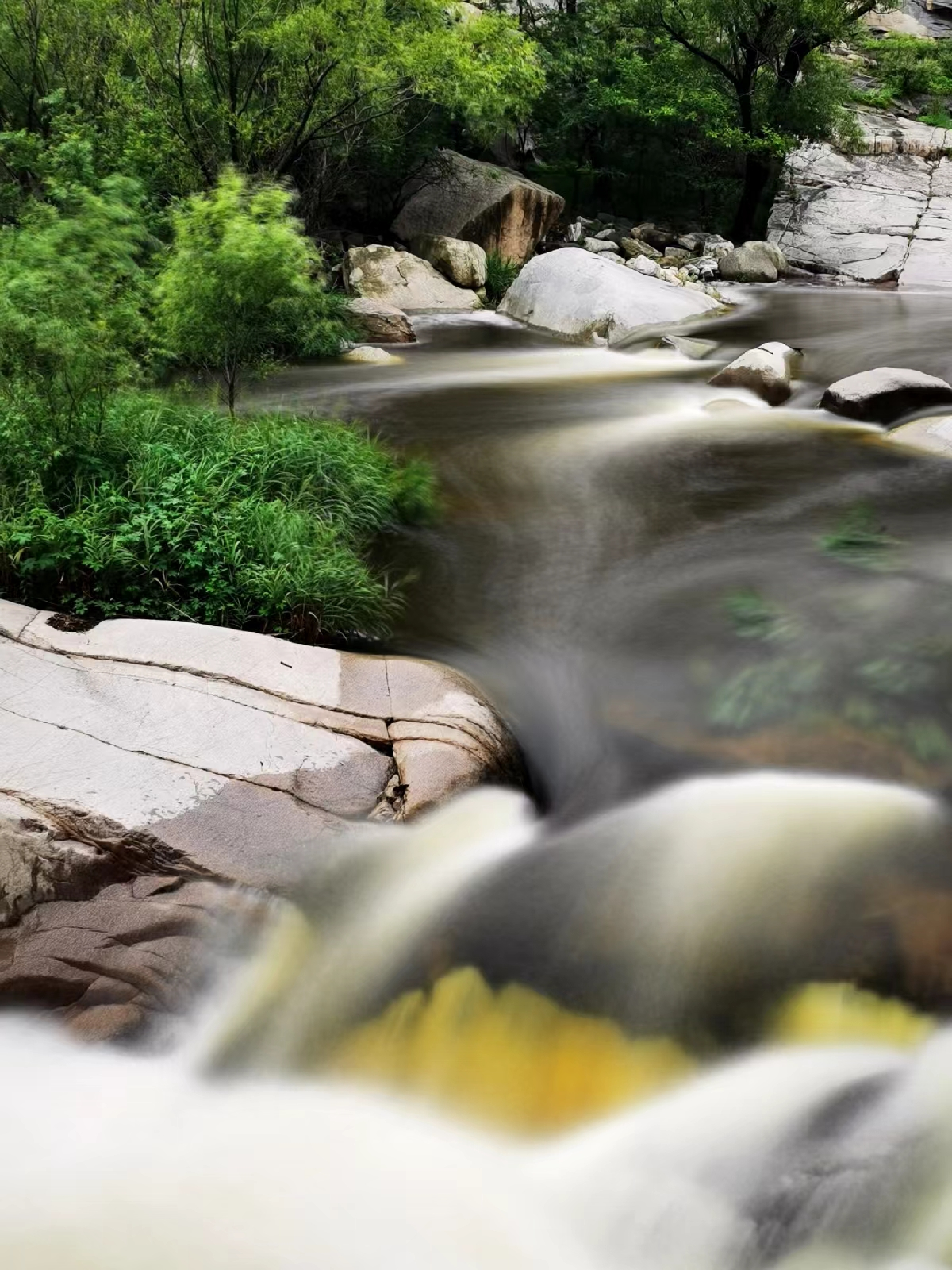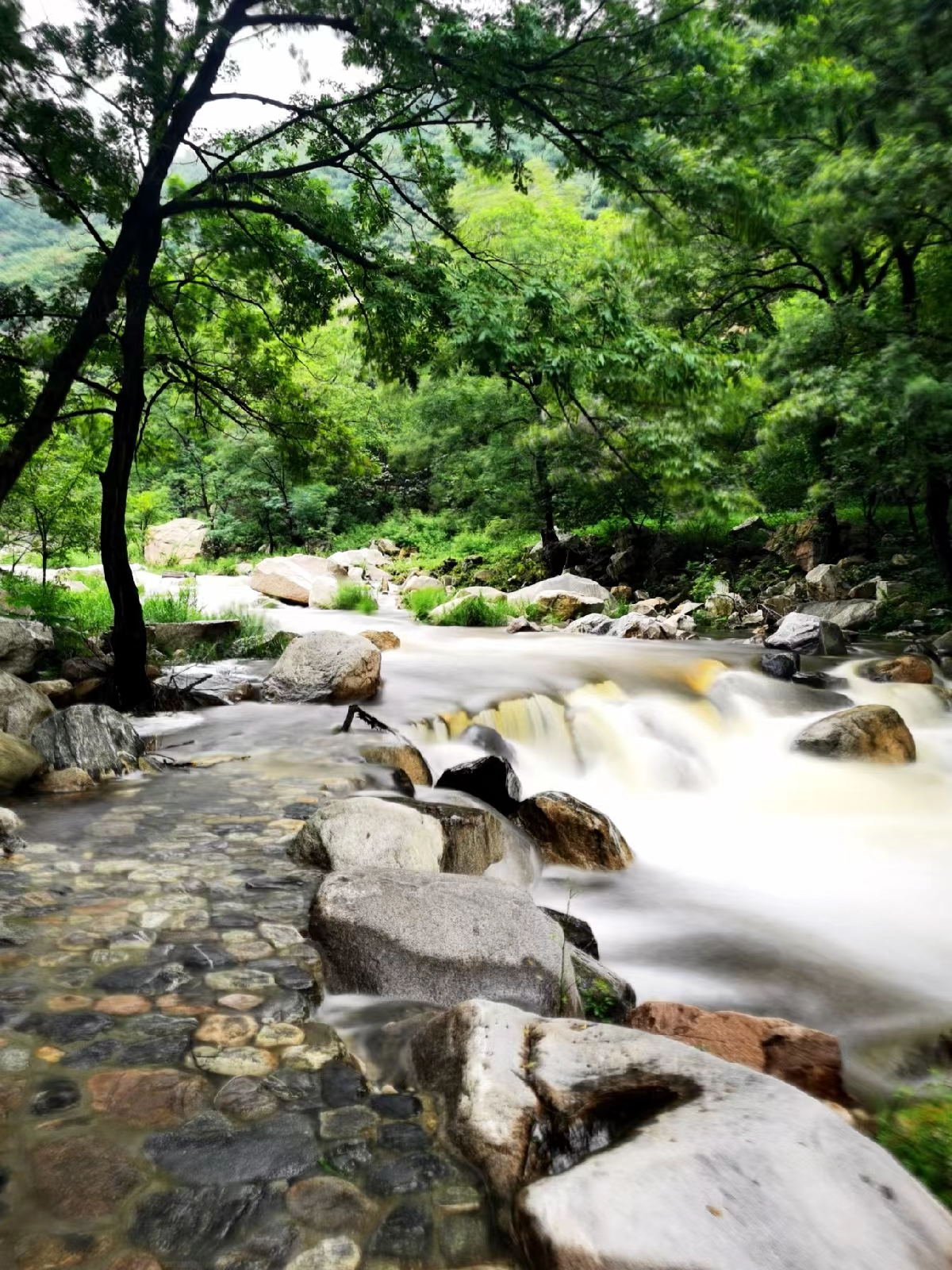 “明月松间照,清泉石上流”,待秋日这奔腾的河水变成涓涓细流,我一定约几许好友,捡一明月之夜,再来赏玩。