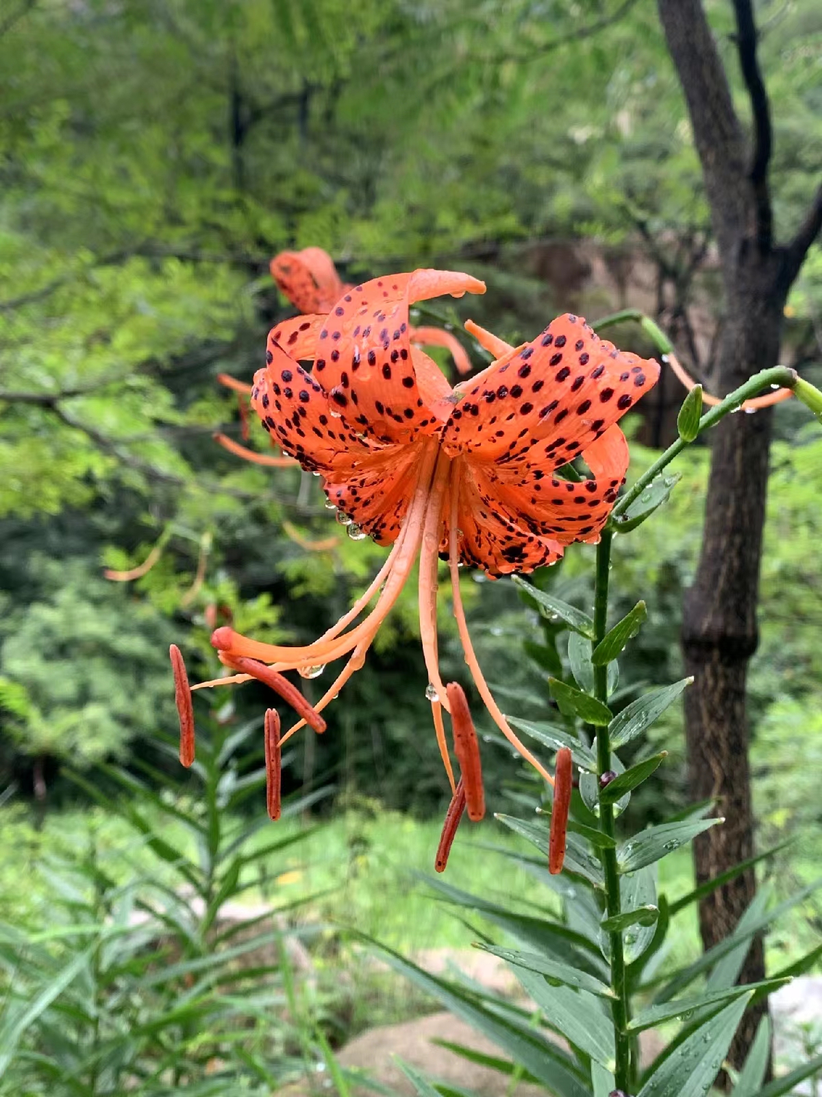 一边听着队长的介绍,一边观赏着美丽的虎皮百合。只见这花倒垂,花瓣外翻,橙红色,其上满布黑色斑点,像极了山林中驰骋的老虎,这“虎皮百合”的名字,我想应该就是由此而来的吧。此处百合,有十几株,大概由于海拔较低的缘故,大多已经开过,眼前盛开的只有一株,但就这一株,虎皮百合的娇艳妩媚,就已经让众驴友陶醉了。