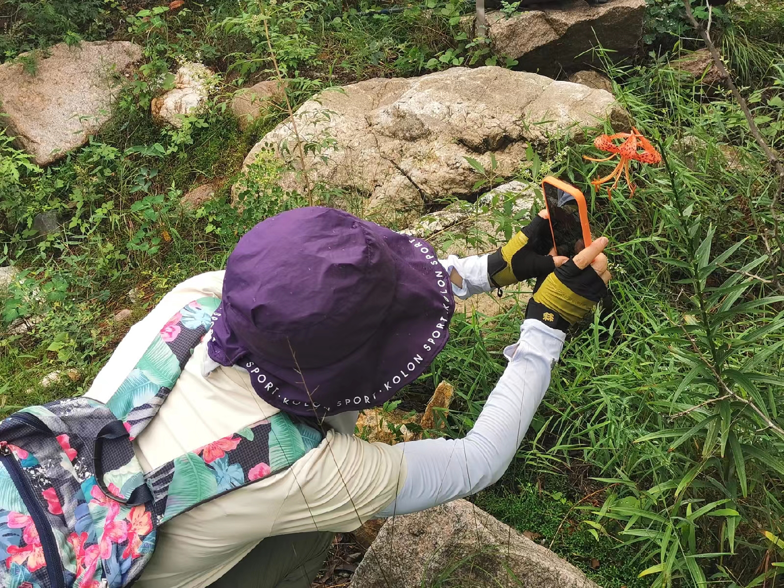 转过一处奇异的山崖,猜想果然没错,只见众驴友正聚集在河边一处树林下,开心地欣赏着百合,此时时间恰好八点三十五分。看我赶来,队长说:这是我们今年发现的第一株盛开的泰山百合。这百合学名虎皮百合,别名卷丹、鬼百合、倒垂莲等,主要生长在海拔400-2500m的山林、草地,路边或水旁。这花不仅可以观赏,其根茎亦可食用,药用更有“养心润肺,清心安神”的功效。