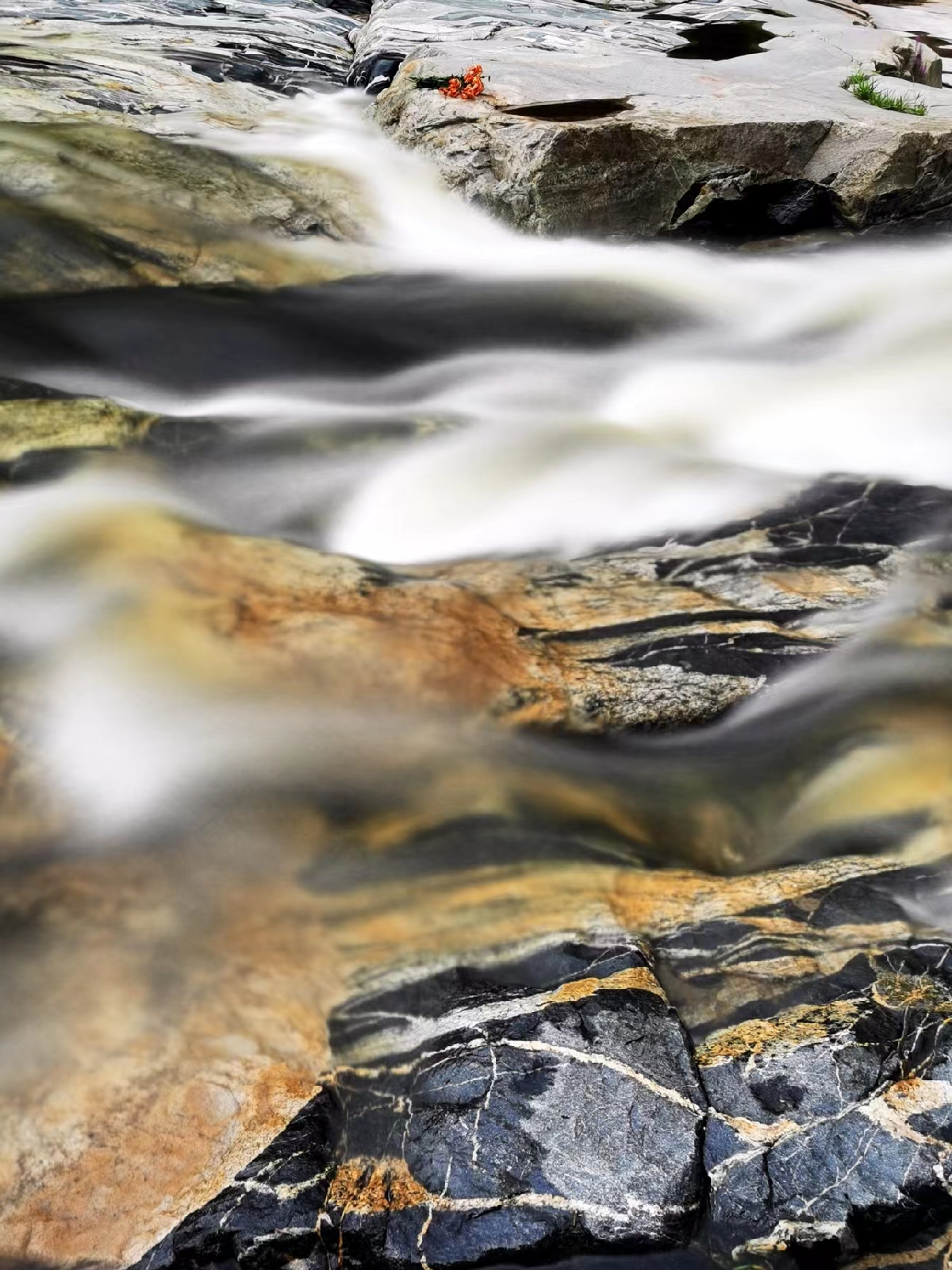 就这样大的水流,我们还能看见花?忍不住,我悄悄嘟囔了一句。不知是有意还是无意,恰在此时,驴友“大长腿”在不远处兴奋的大呼小叫,“太美了,太美了”。走近一看,原来,这水流在一转弯处,猛然收窄,然后突然咂向十几米下河道上的岩石,形成了落差较大的瀑布和一串串、一朵朵美丽的浪花,之后,又舒展地在一块块花纹奇异瑰丽的石头上轻轻流过。那种动与静;波澜壮阔与柔美婉约浑然一体的画面,真的是太棒了。